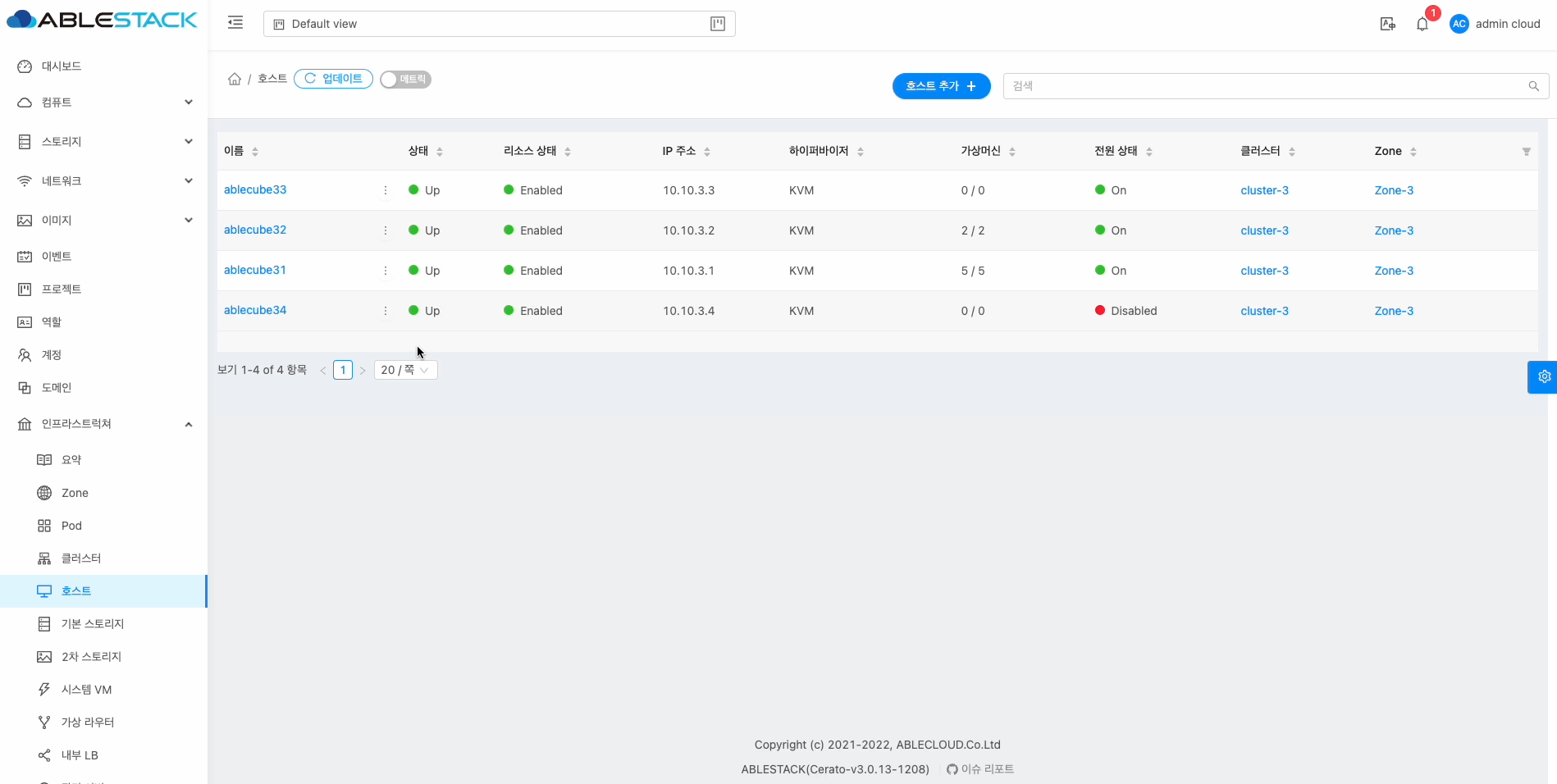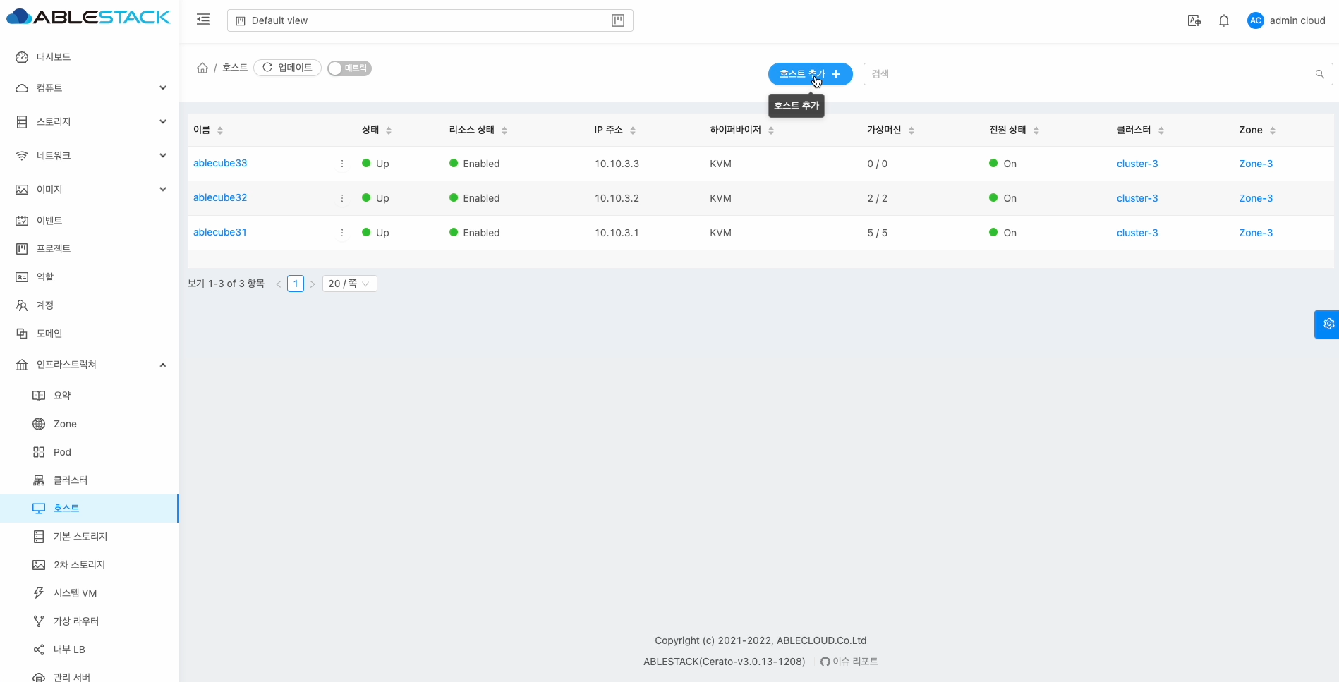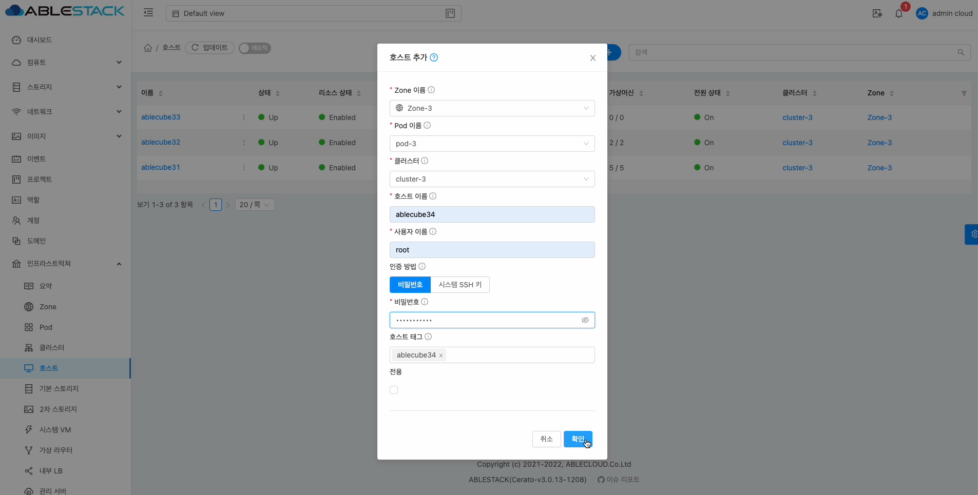 ABLESTACK Cube 호스트 추가 작업은 반드시 모든 구성요소(Cube 호스트, 스토리지센터 가상머신, 클라우드센터 가상머신)가 정상(Running) 동작 상태에서만 진행하십시오.