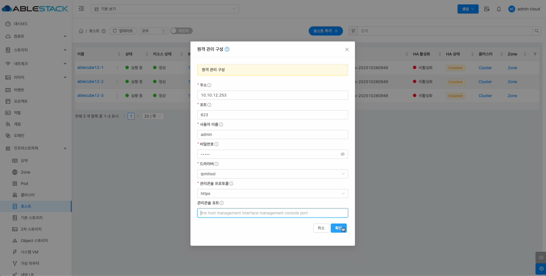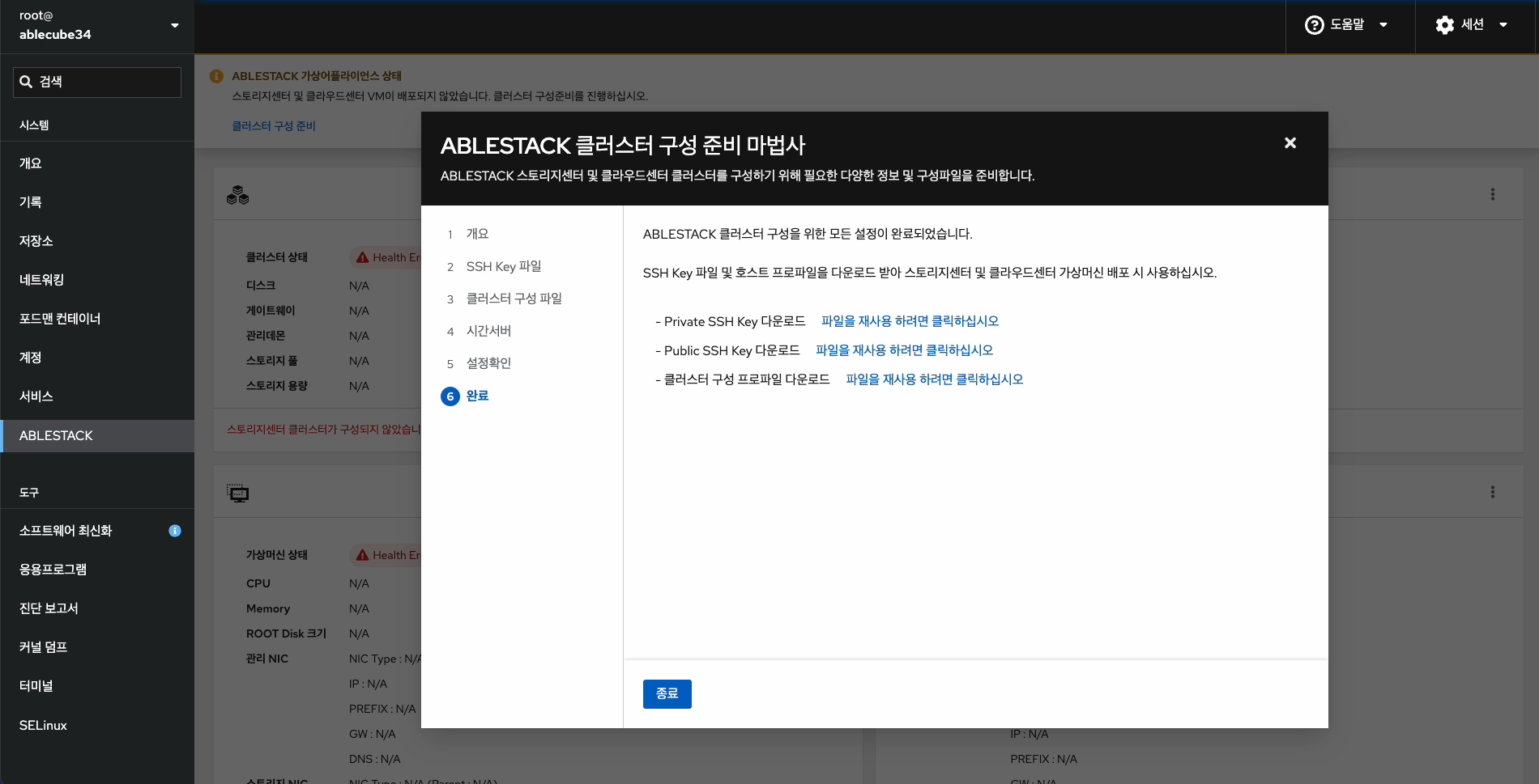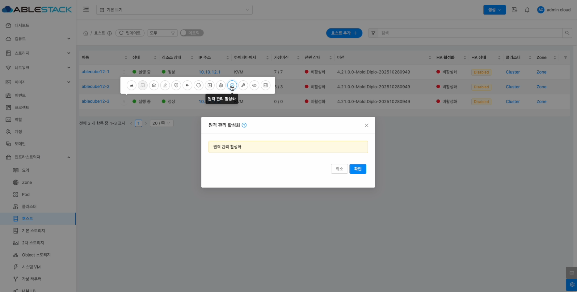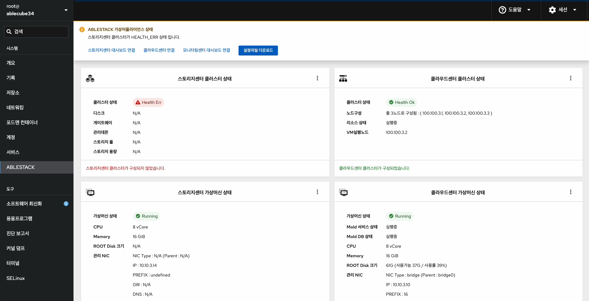 ABLESTACK Cube 호스트 추가 작업은 반드시 모든 구성요소(Cube 호스트, 스토리지센터 가상머신, 클라우드센터 가상머신)가 정상(Running) 동작 상태에서만 진행하십시오.