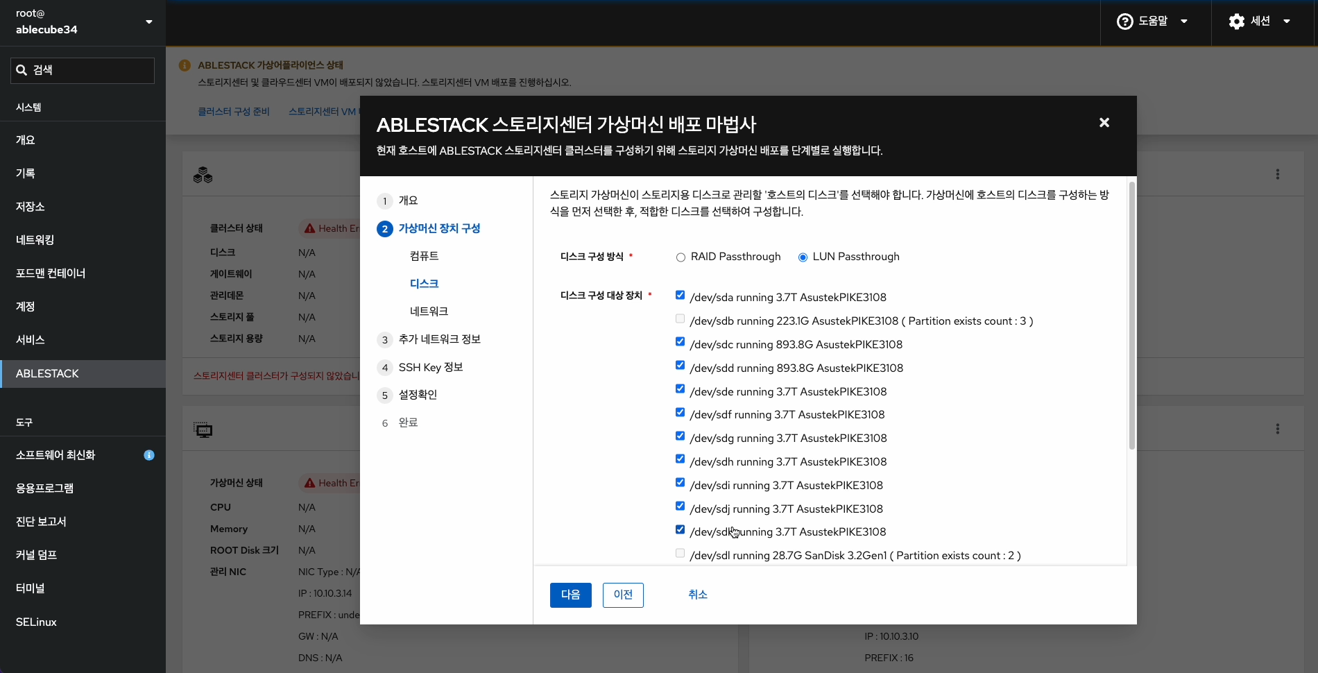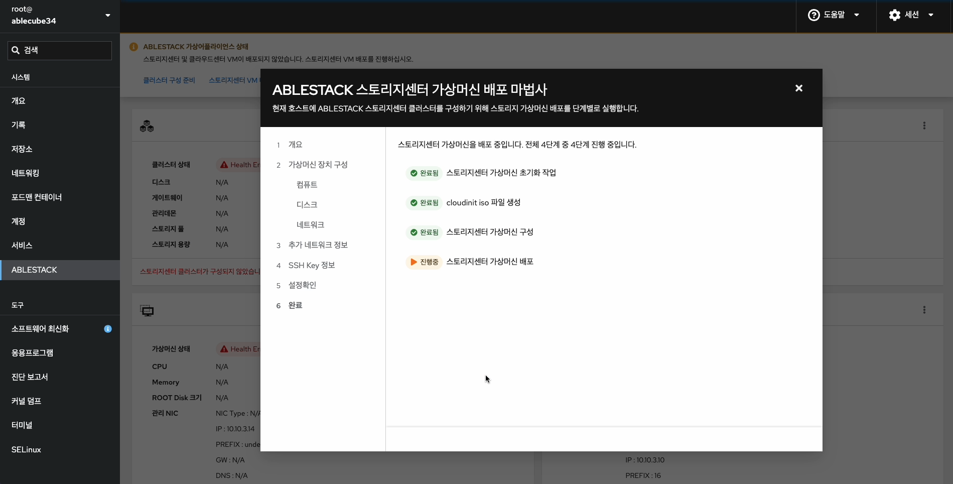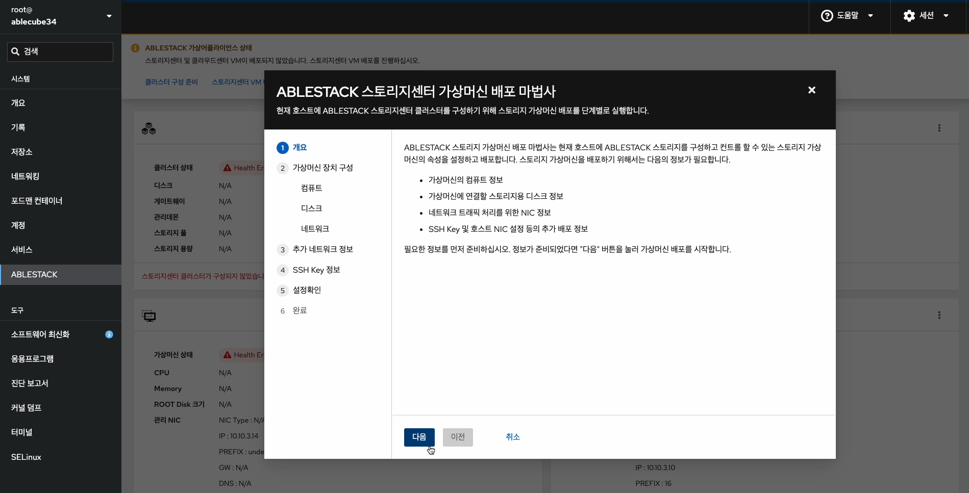 - ABLESTACK 스토리지센터 가상머신 배포 마법사 화면입니다.