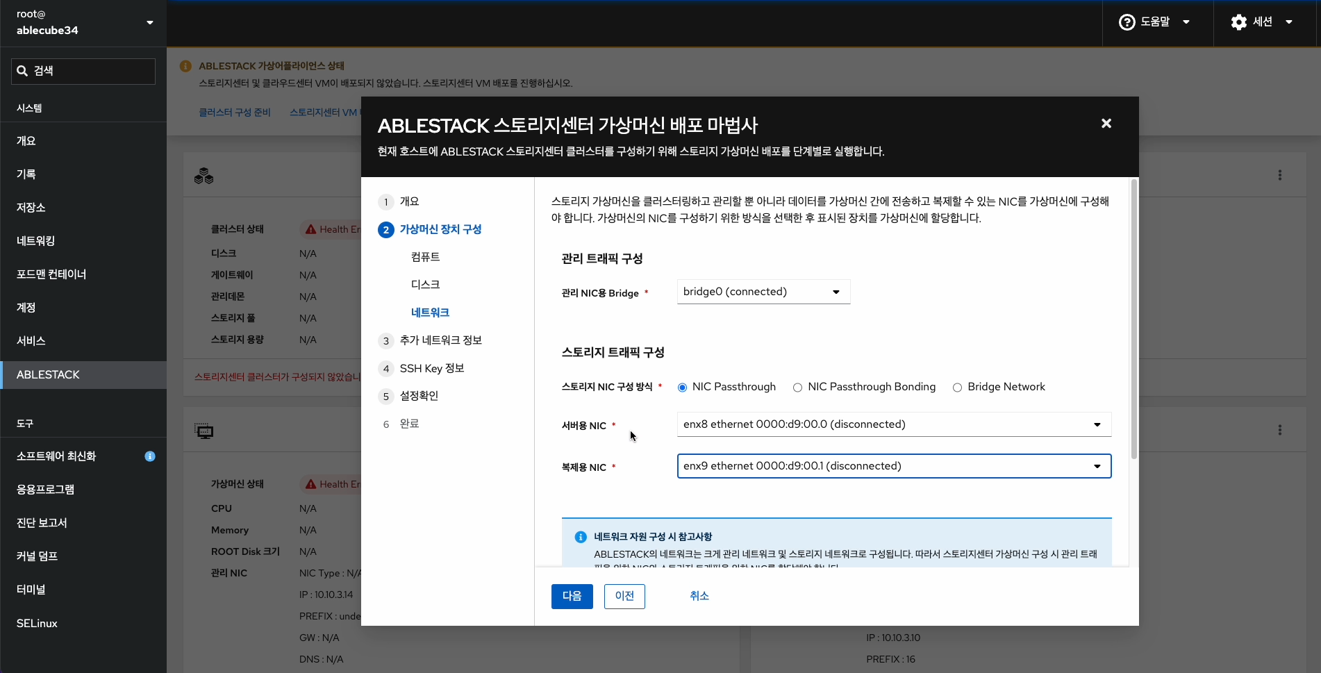 스토리지 센터 가상머신의 관리 및 스토리지 전용 네트워크를 구성하게 됩니다.