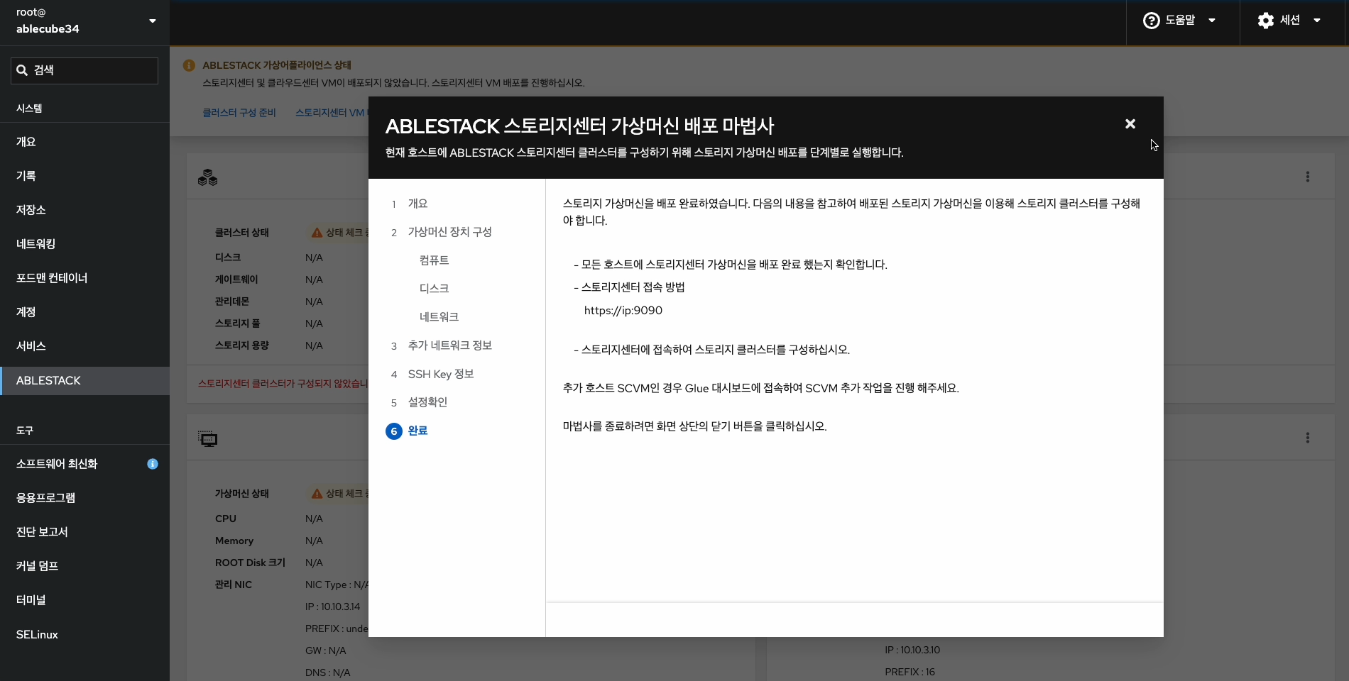- 스토리지센터 가상머신 배포 완료 후 화면입니다.