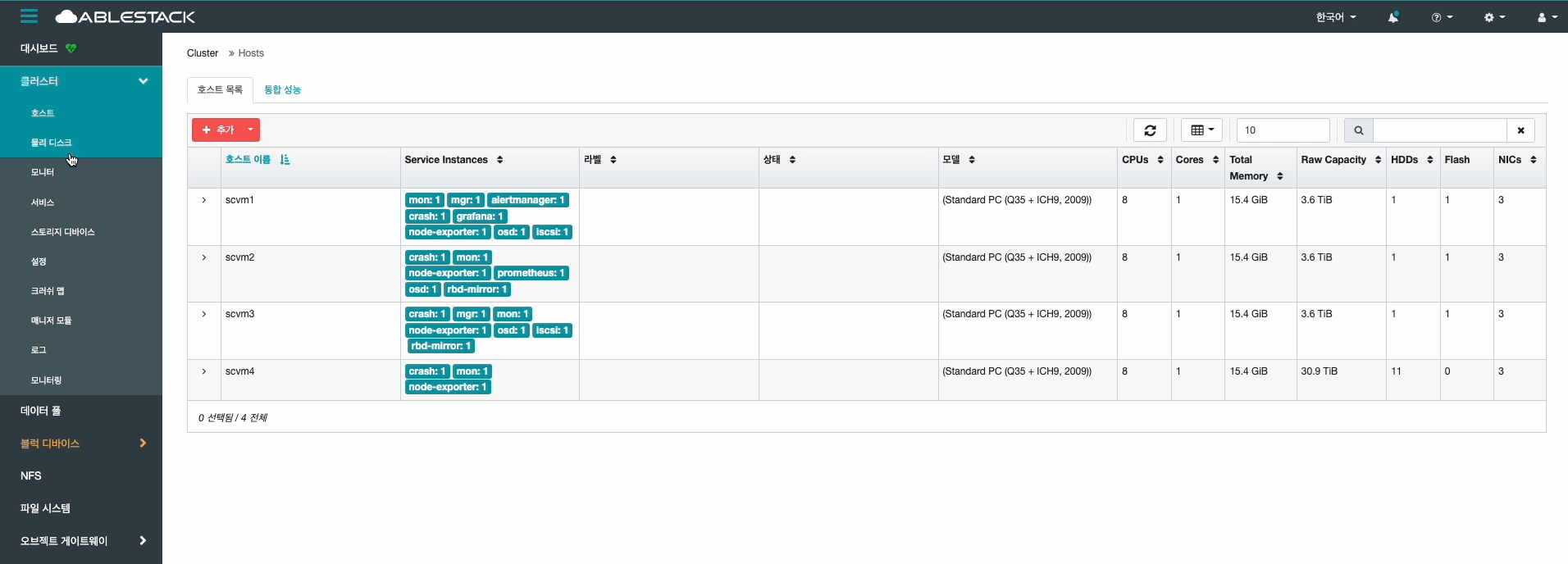 idx 호스트 명 호스트 IP SCVM MNGT IP 호스트 PN IP SCVM PN IP SCVM CN IP 1 ablecube31 10.10.3.1 10.10.3.11 100.100.3.1 100.100.3.11 100.200.3.11 2 ablecube32 10.10.3.2 10.10.3.12 100.100.3.2 100.100.3.12 100.200.3.12 3 ablecube33 10.10.3.3 10.10.3.13 100.100.3.3 100.100.3.13 100.200.3.13 4 ablecube34 10.10.3.4 10.10.3.14 100.100.3.4 100.100.3.14 100.200.3.14 -