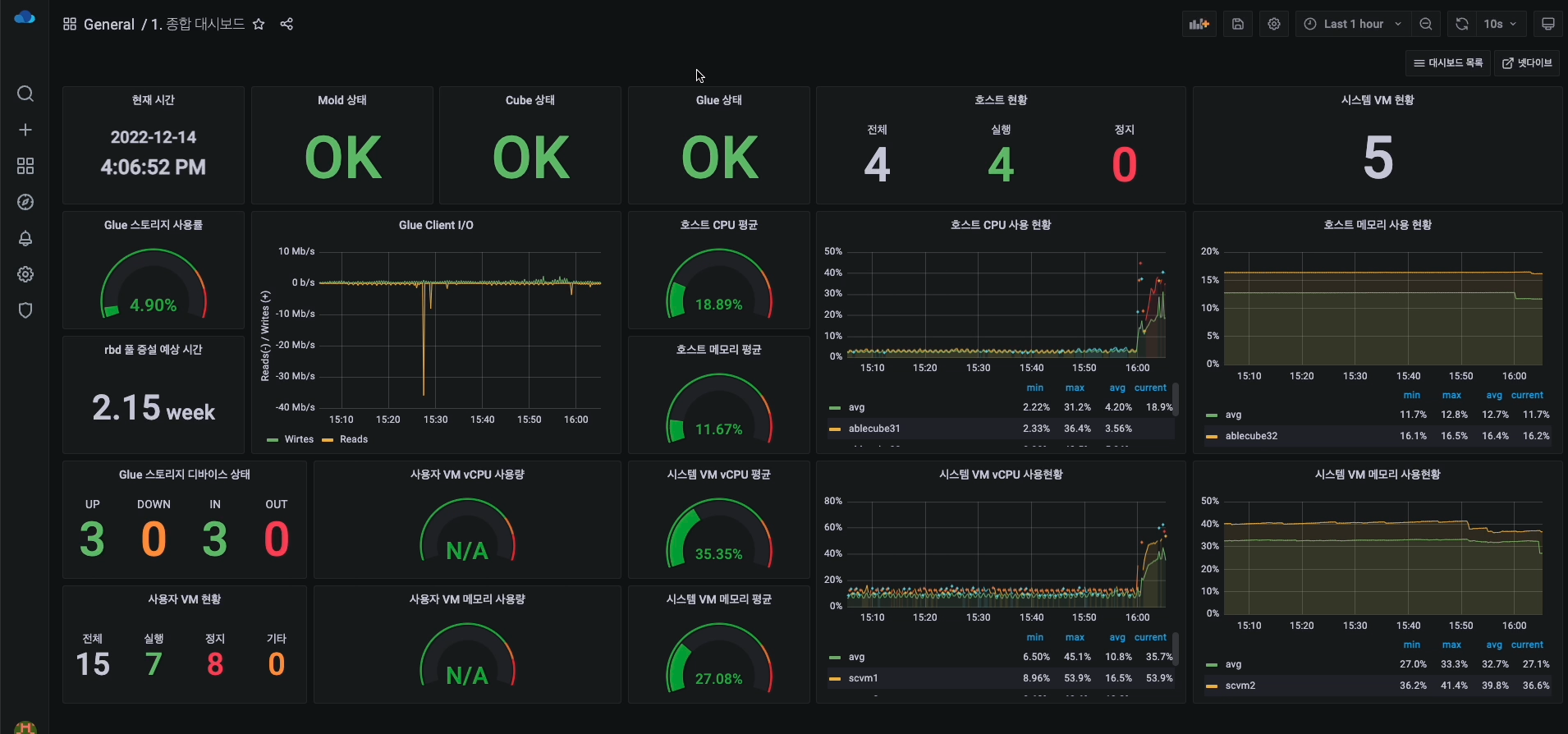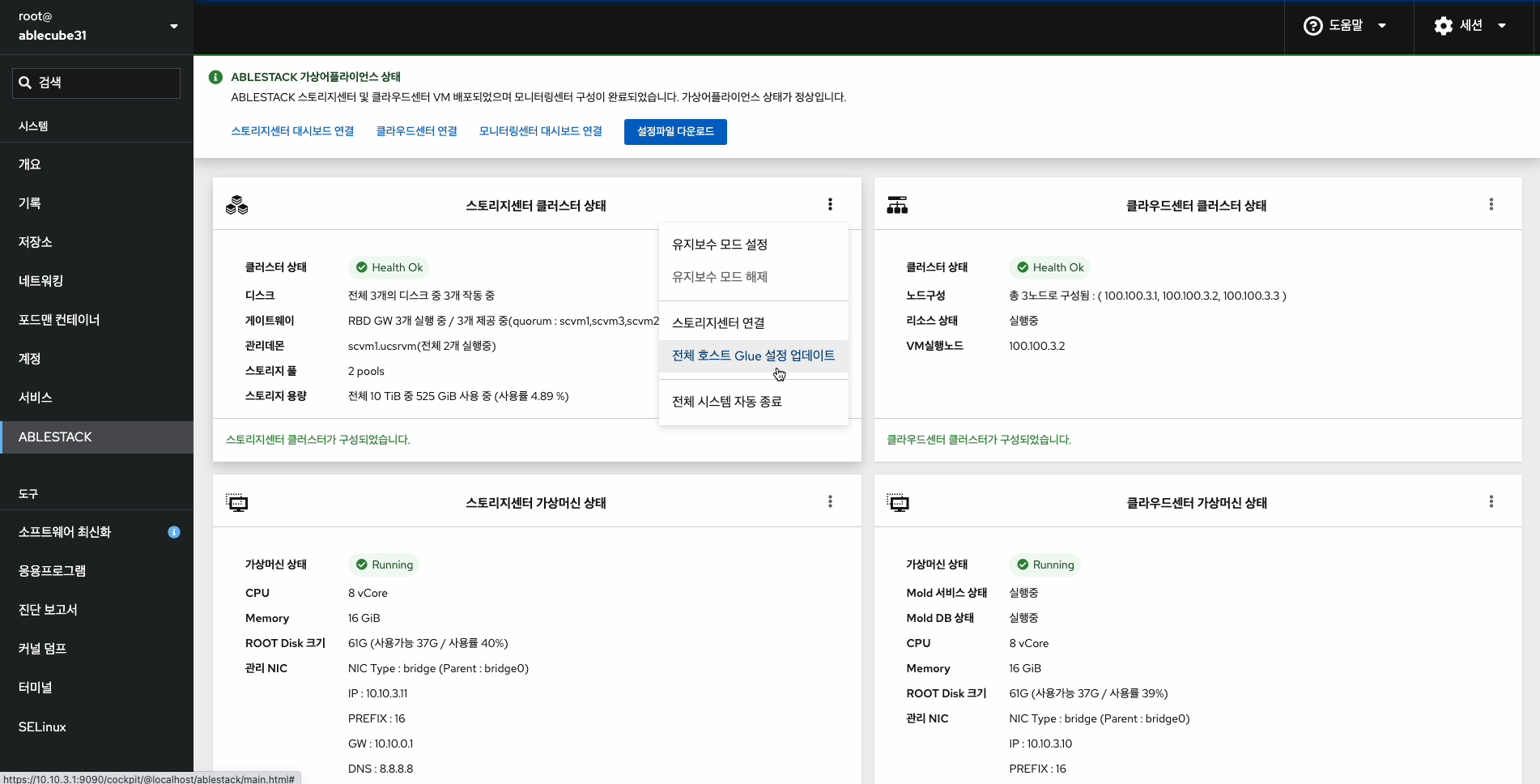 - 1번 Cube에서 ABLESTCK > 스토리지센터 클러스터 상태 카드 메뉴의 전체 호스트 Glue 설정 업데이트 를 클릭합니다.