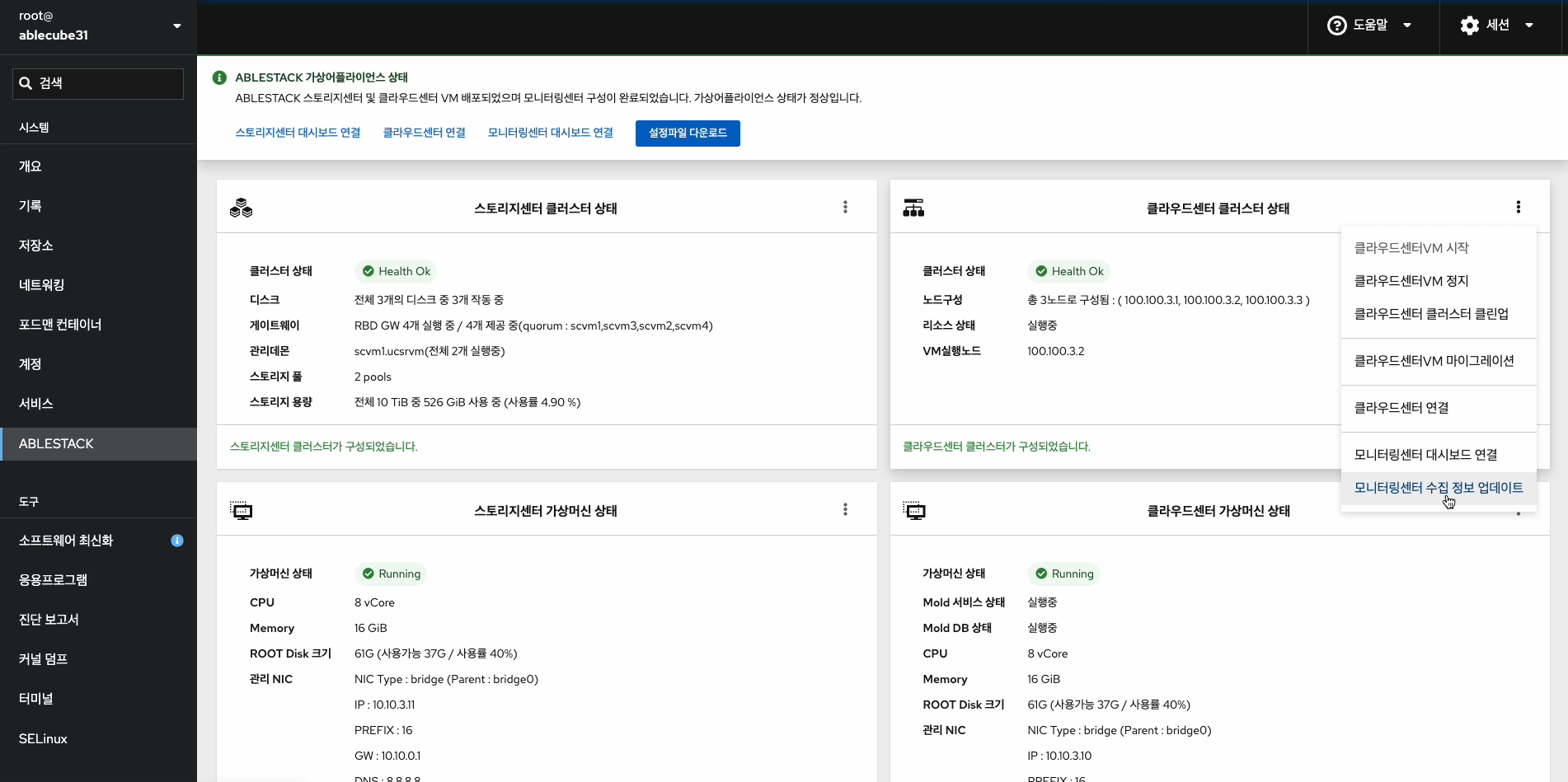 - Cube에서 ABLESTCK > 클라우드센터 클러스터 상태 카드 메뉴의 모니터링센터 수집 정보 업데이트 를 클릭합니다.