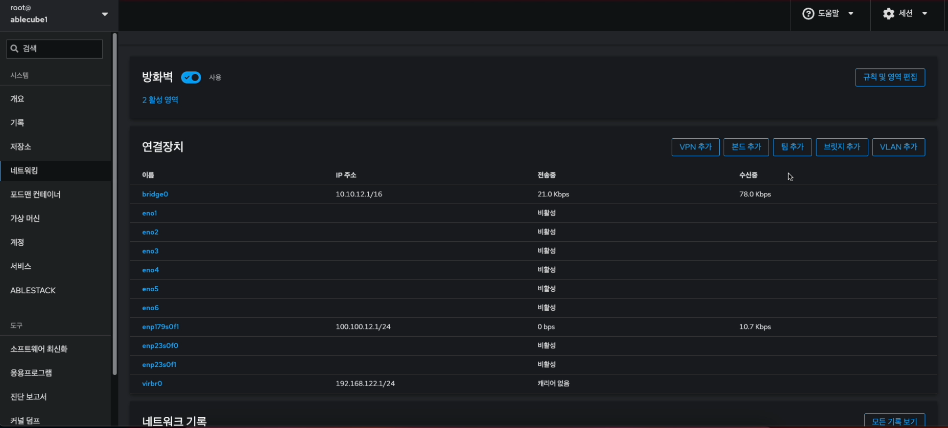 해당 화면에서 방화벽 설정 및 본드(bond), 브릿지(bridge), VLAN 구성을 진행합니다.