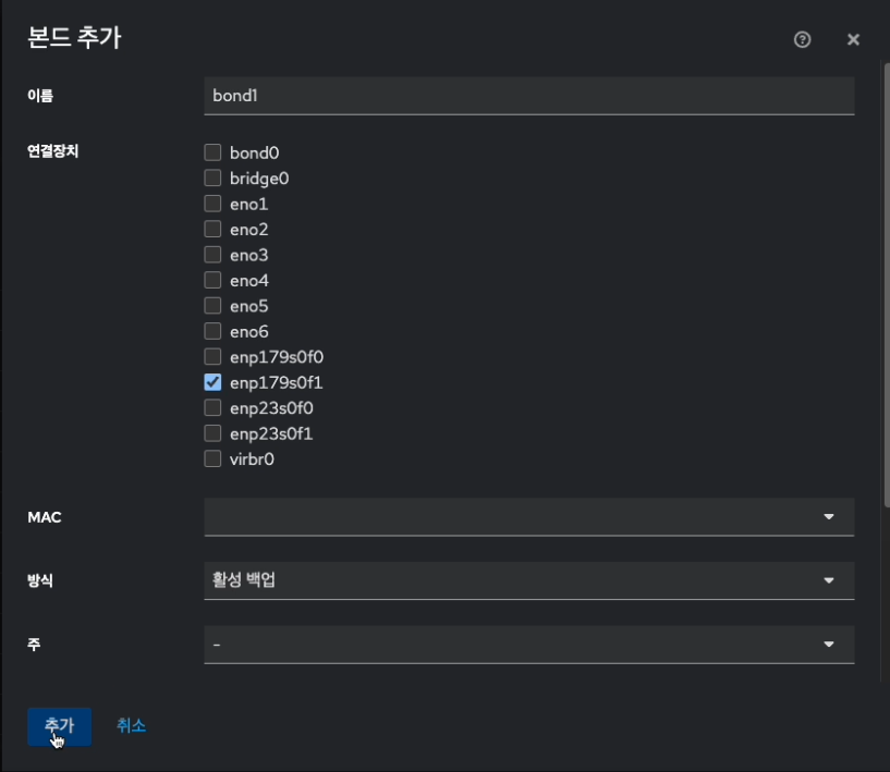 본드(bond) 구성이 필요한 경우에는 먼저 본드(bond) 구성을 완료한 뒤 브릿지(bridge)를 생성해 사용해야 합니다. 이때 브릿지 설정에서 IPv6 활성화 항목은 반드시 사용 안함 으로 설정해야 합니다.