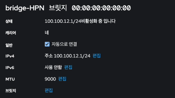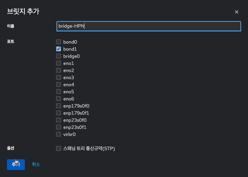 - 브릿지 이름을 bridge-HPN 을 입력해주고, 연결장치는 bond 1 를 선택하고 저장 버튼을 클릭합니다.