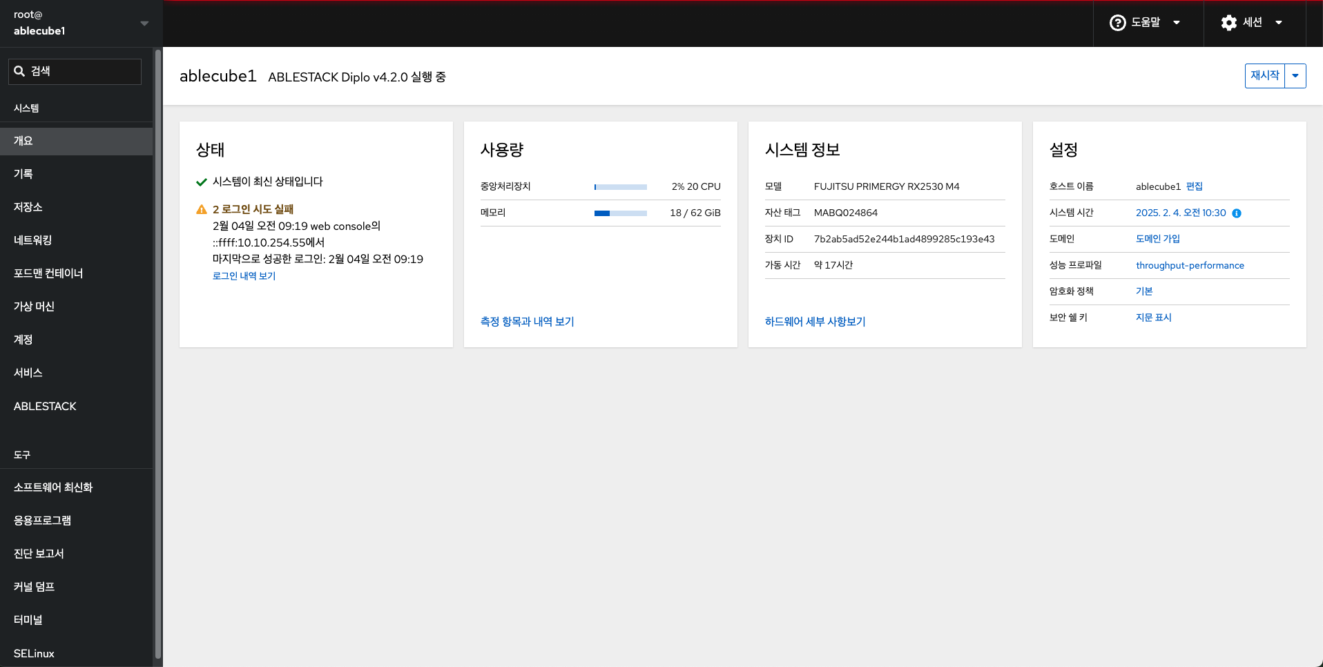 일반적으로 호스트명은 "ablecube1"과 같이 ablecube + 넘버링 형태로 지정하면 향후 관리가 용이합니다.