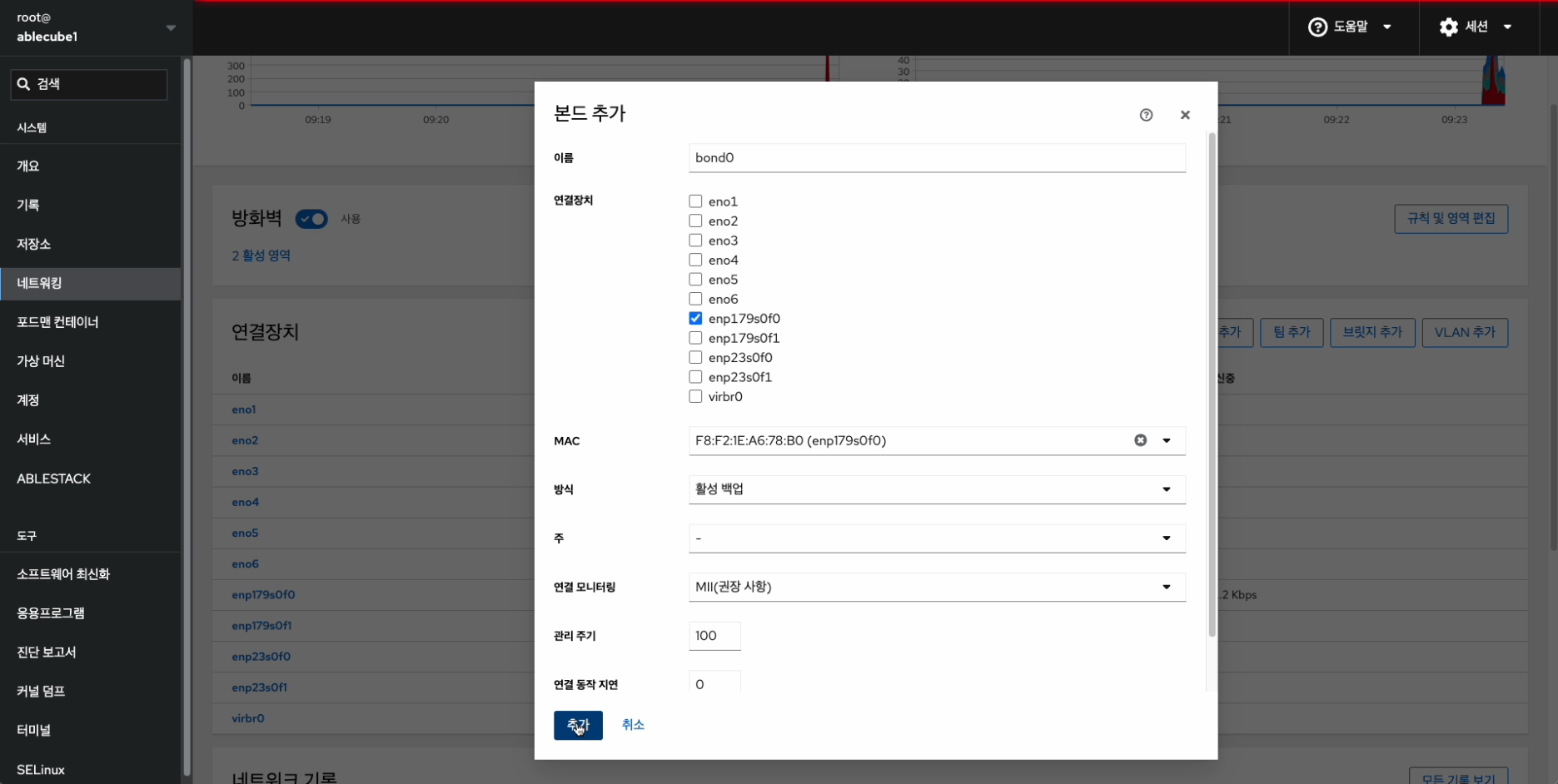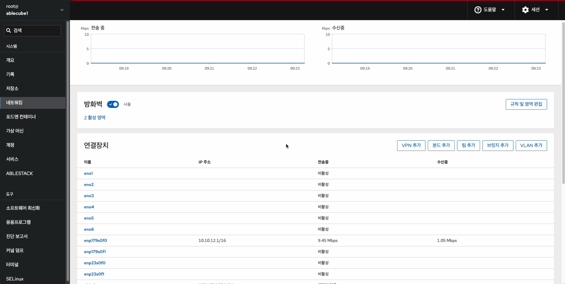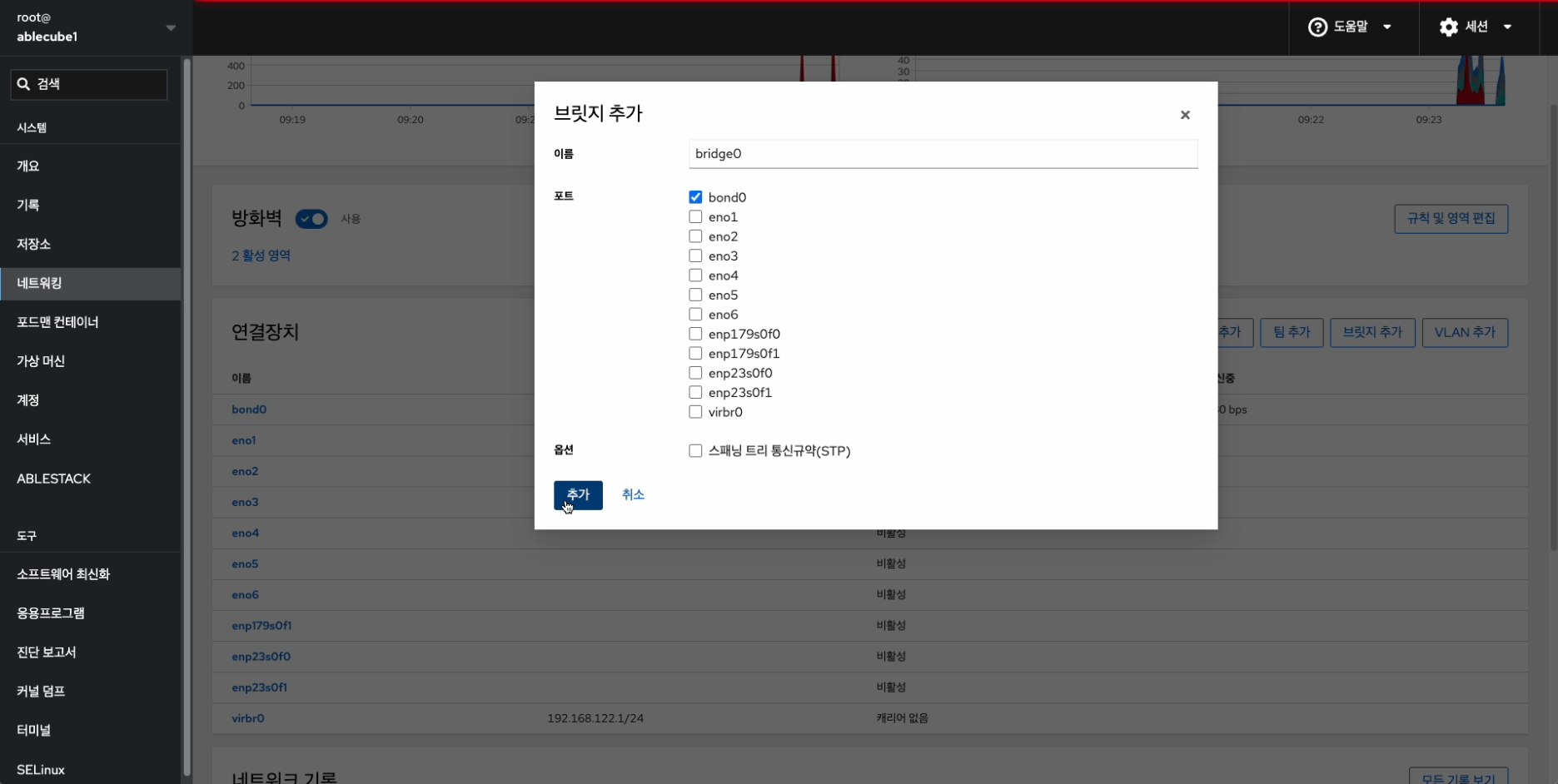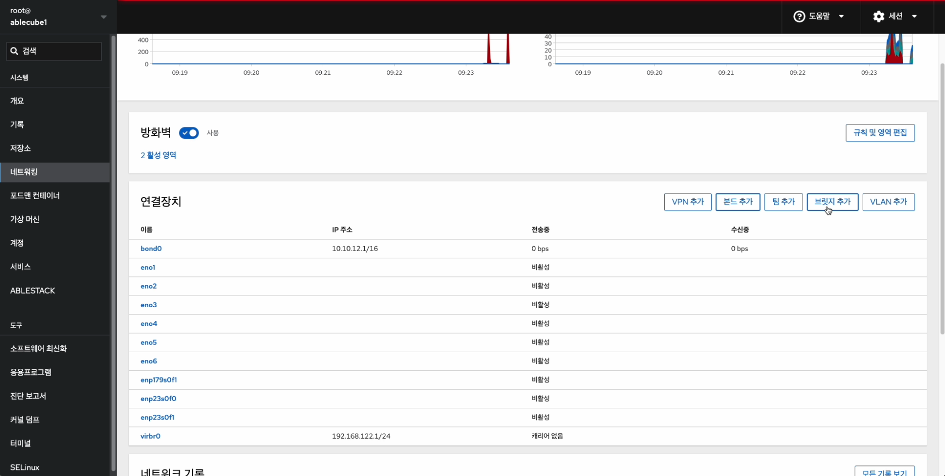 해당 화면에서 방화벽 설정 및 본드(bond), 브릿지(bridge), VLAN 구성을 진행합니다.