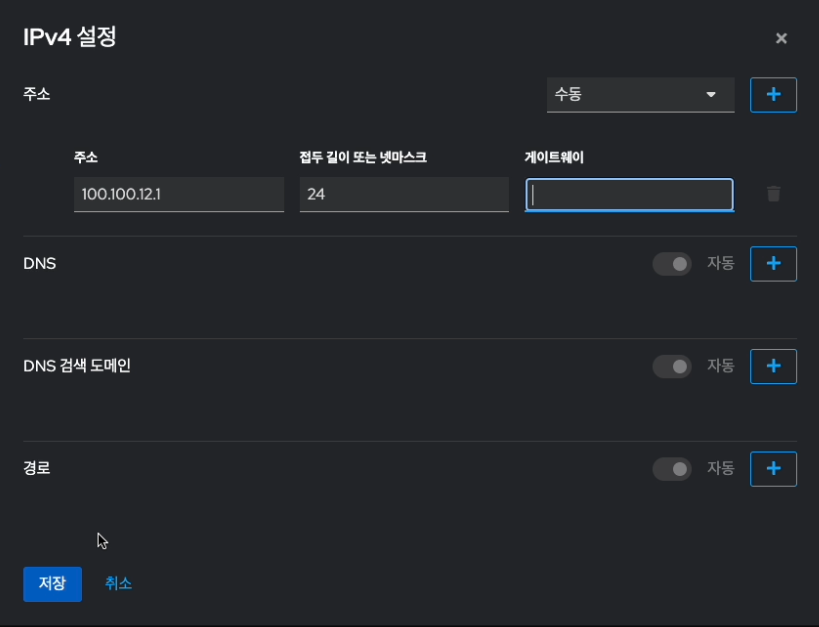 - IPv4 항목의 편집 버튼을 눌러 들어온 IPv4 설정 화면입니다.