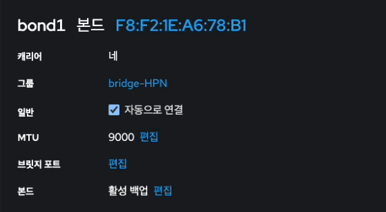 본드(bond) 구성이 필요한 경우에는 먼저 본드(bond) 구성을 완료한 뒤 브릿지(bridge)를 생성해 사용해야 합니다. 이때 브릿지 설정에서 IPv6 활성화 항목은 반드시 사용 안함 으로 설정해야 합니다.