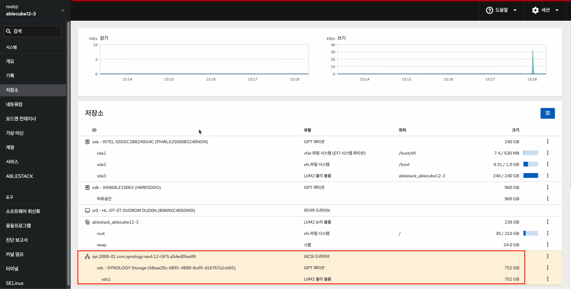 - 기존 GFS(공유 파일 시스템)으로 사용 중인 스토리지(iSCSI 드라이브, Fibre channel 등 외부 스토리지)가 추가되는 호스트에도 정상적으로 설정되어 있는지 확인합니다.