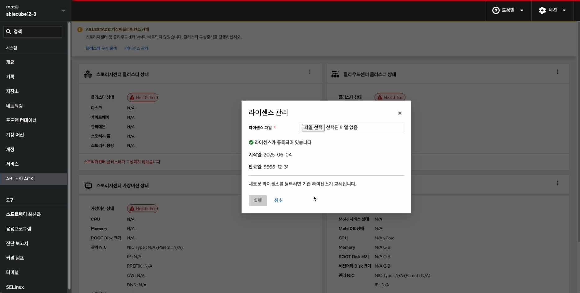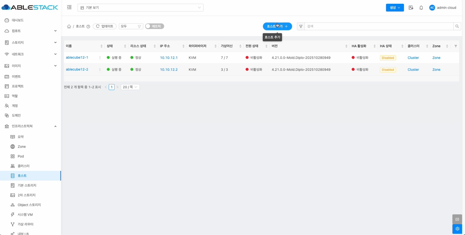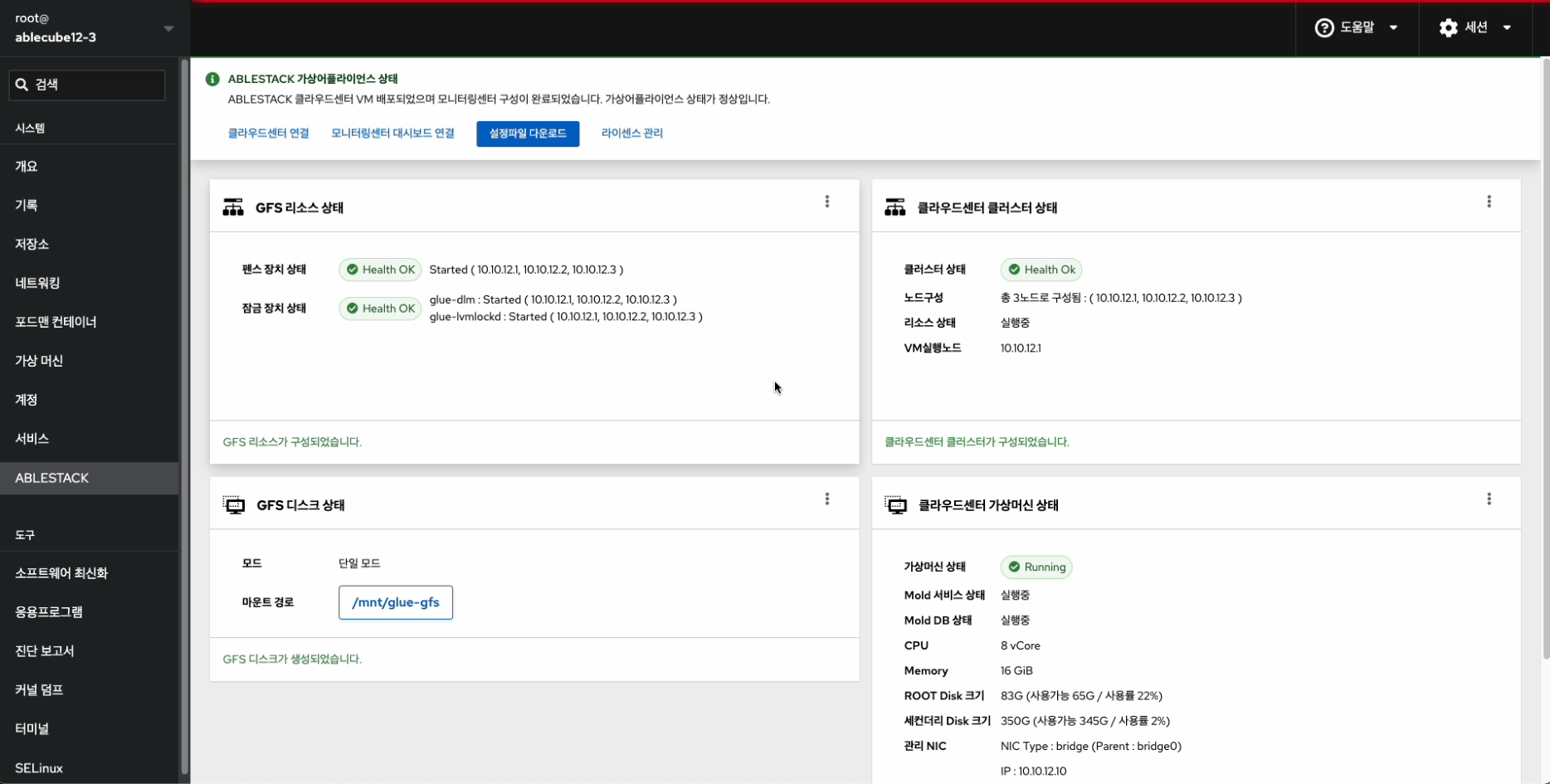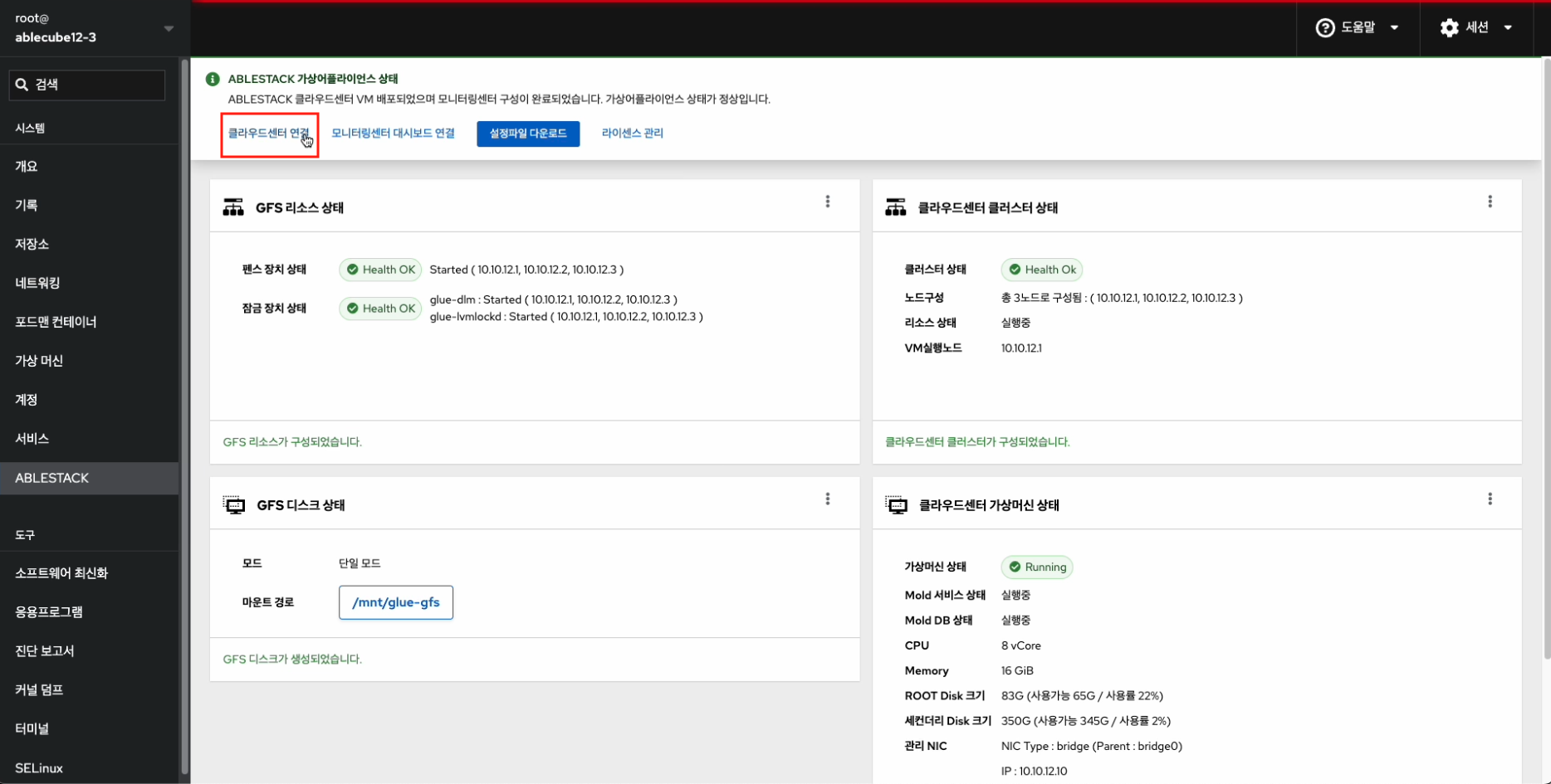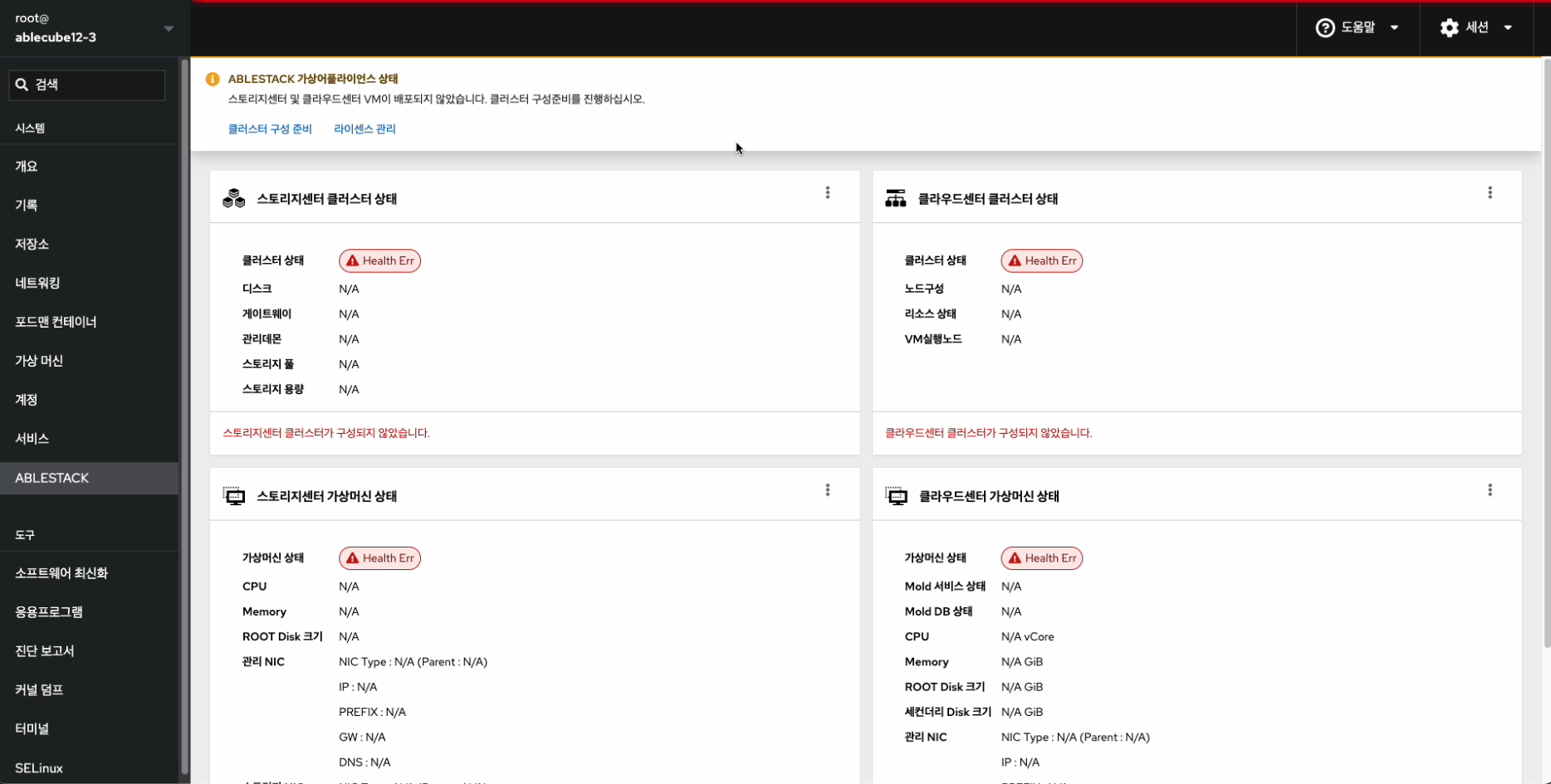 ABLESTACK Cube 호스트 추가 작업은 반드시 모든 구성요소(Cube 호스트, GFS 리소스 및 디스크 상태, 클라우드센터 가상머신)가 정상(Running) 동작 상태에서만 진행하십시오.