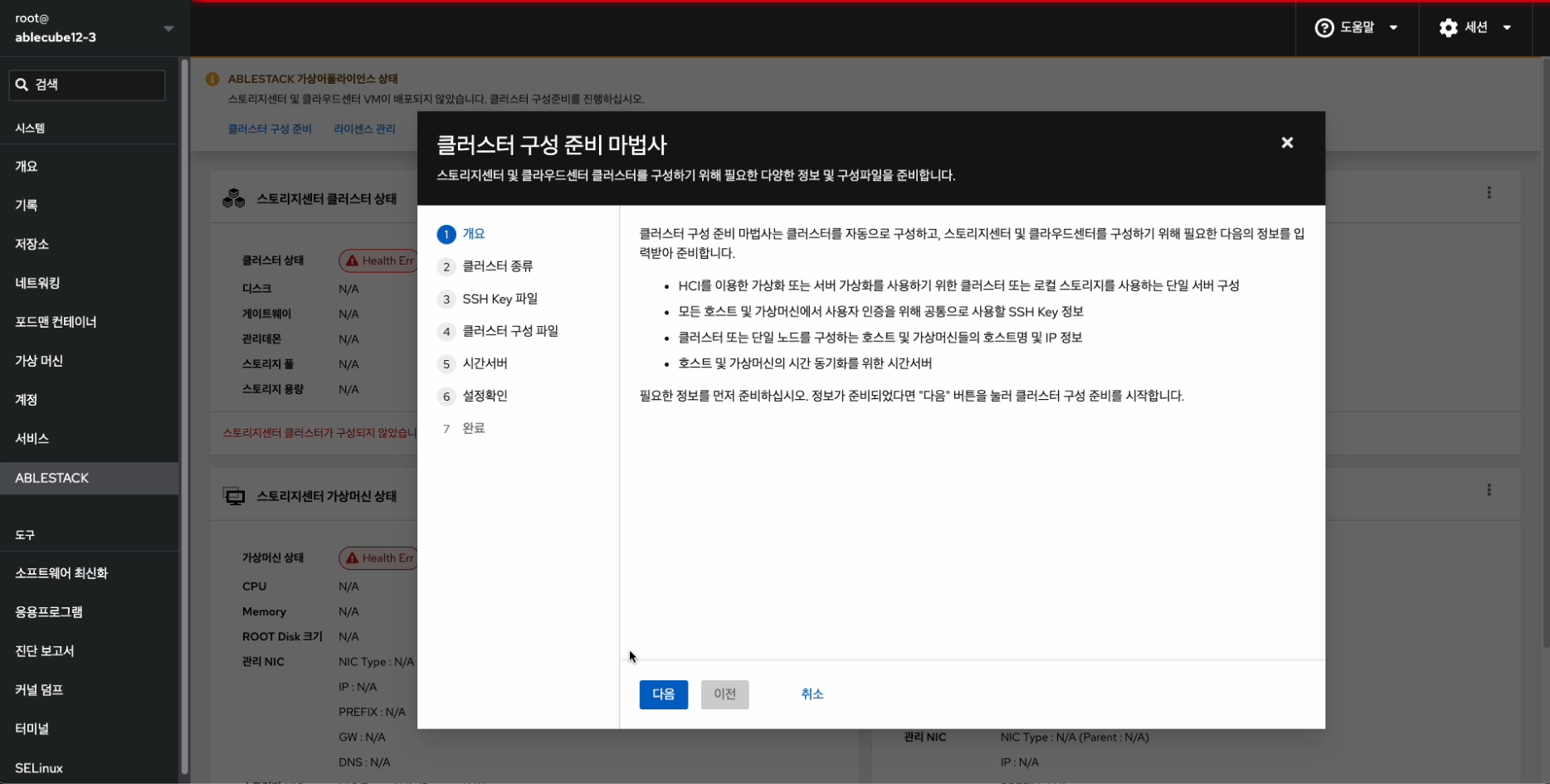 - ABLESTACK 구성을 하는데 필요한 정보를 입력 받아 클러스터 구성을 준비하는 마법사 화면입니다.