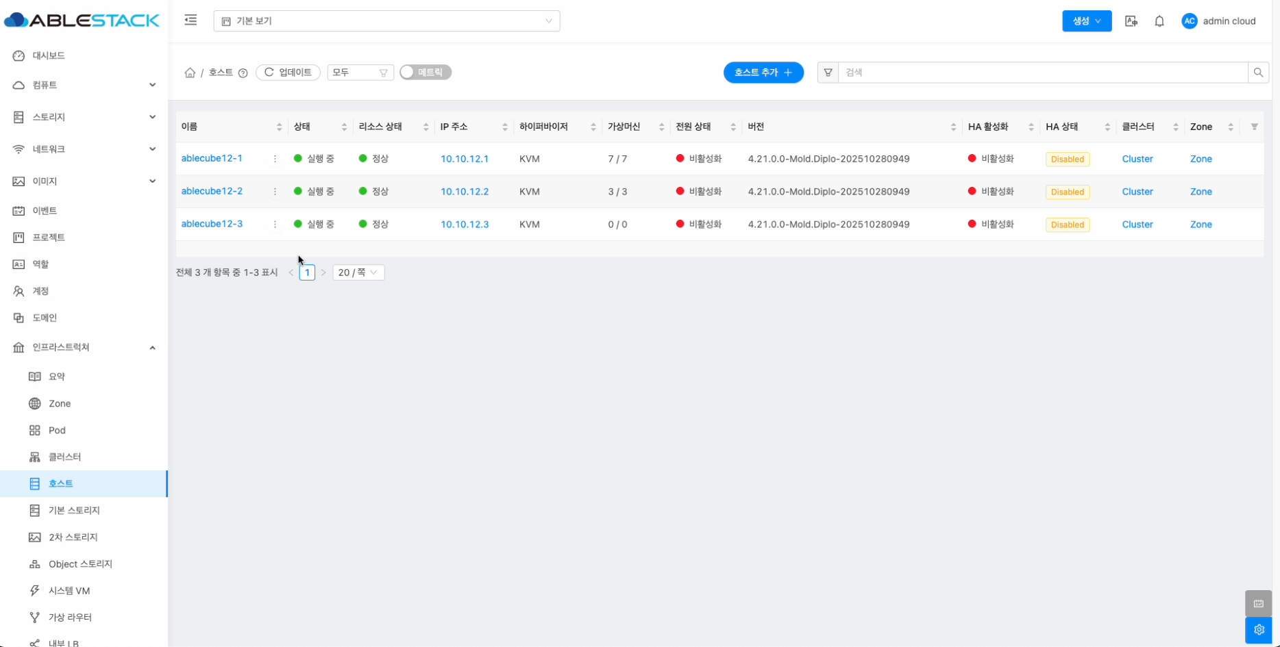 idx 호스트 명 호스트 IP 1 ablecube12-1 10.10.12.1 2 ablecube12-2 10.10.12.2 3 ablecube12-3 10.10.12.3 -
