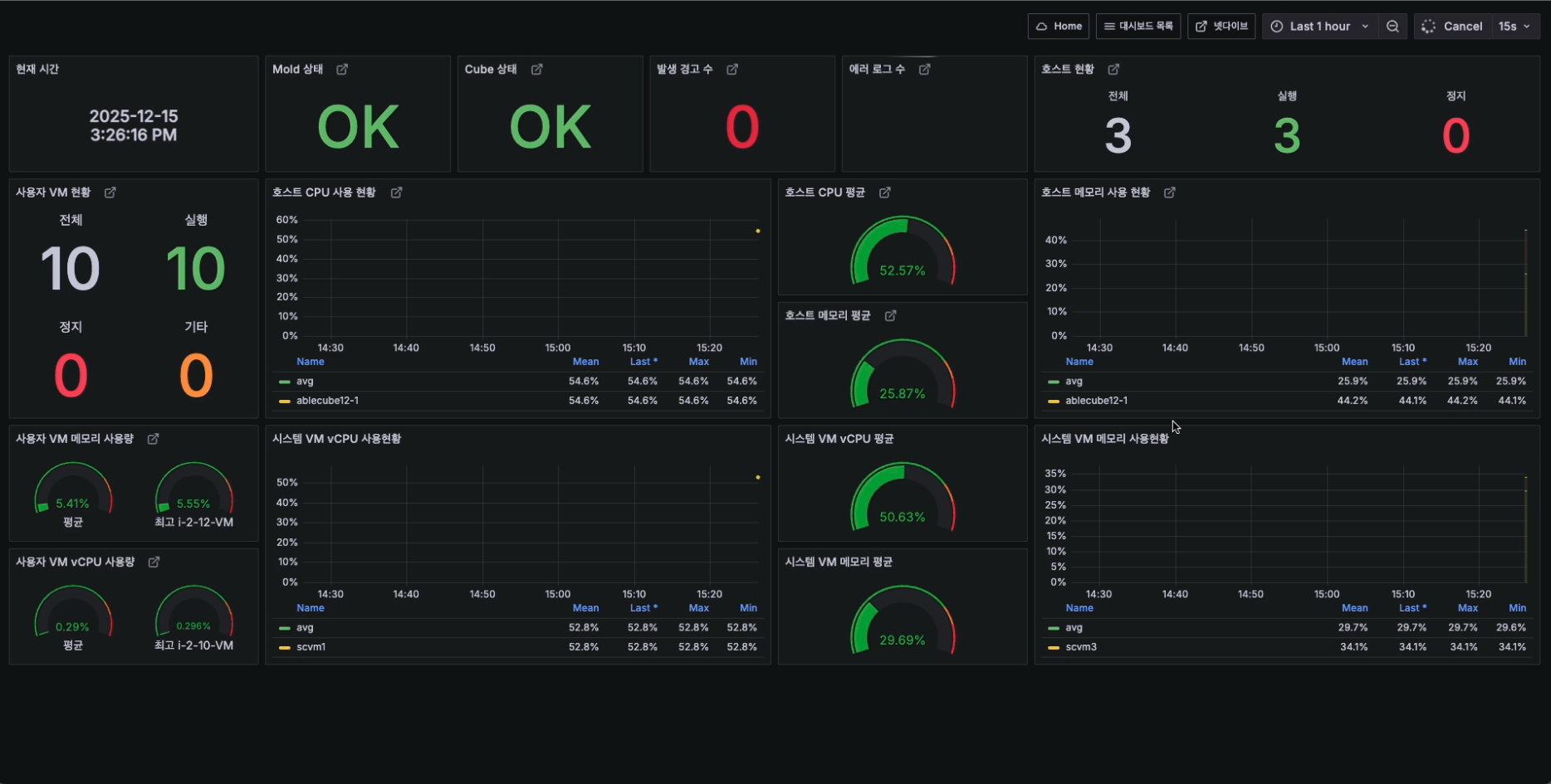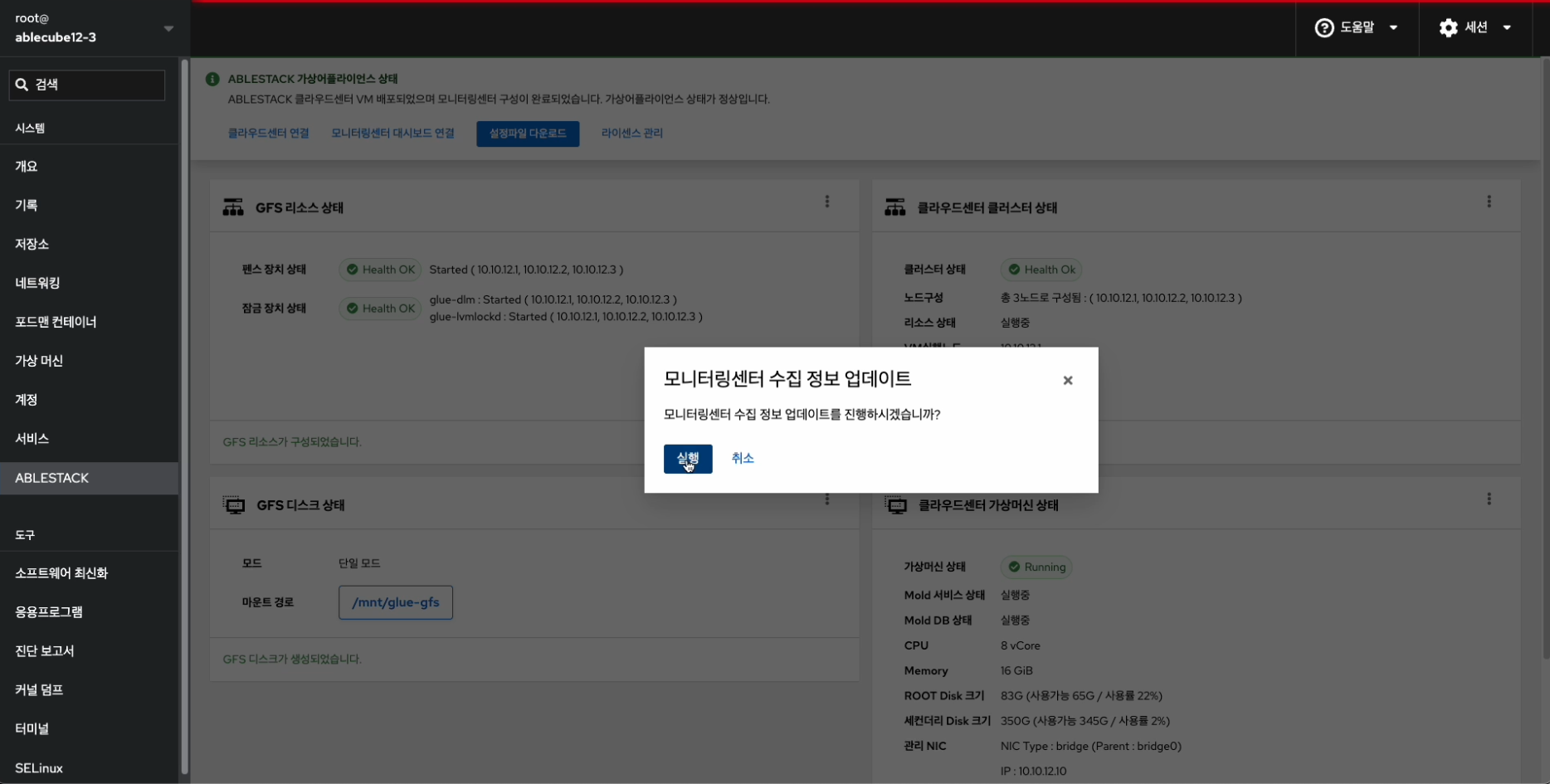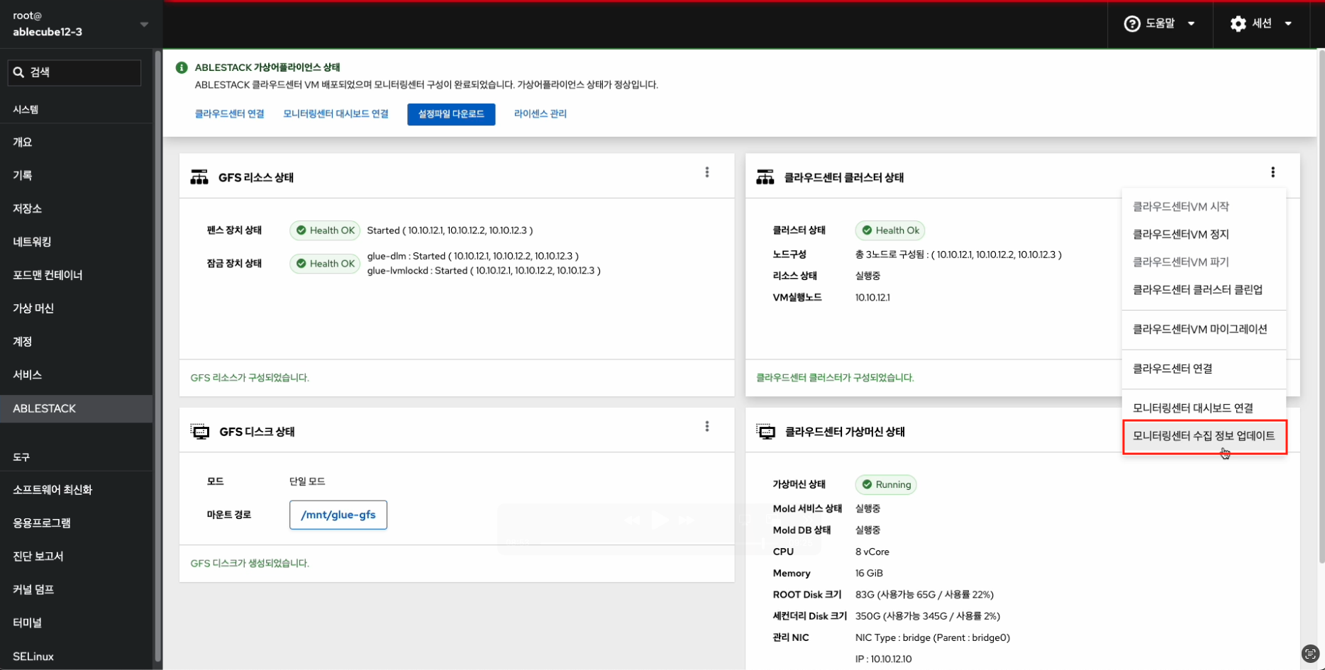 - Cube에서 ABLESTCK > 클라우드센터 클러스터 상태 카드 메뉴의 모니터링센터 수집 정보 업데이트 를 클릭합니다.