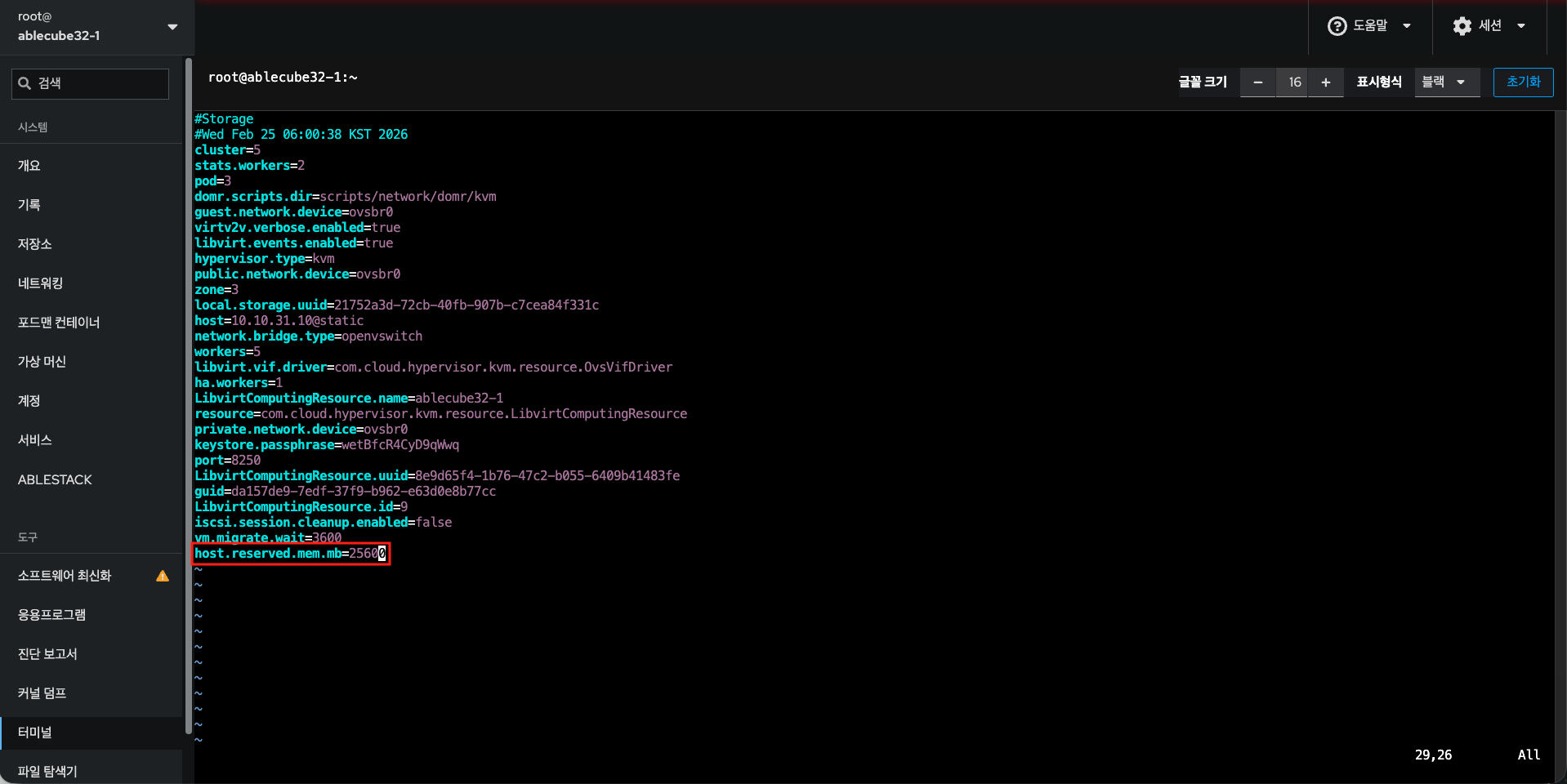 - host.reserved.mem.mb=25600 라인을 추가하고 :wq 명령어로 저장합니다.