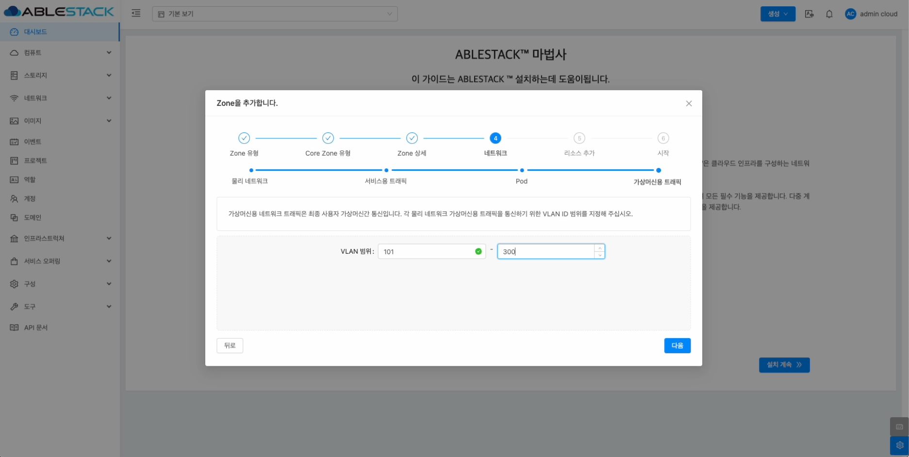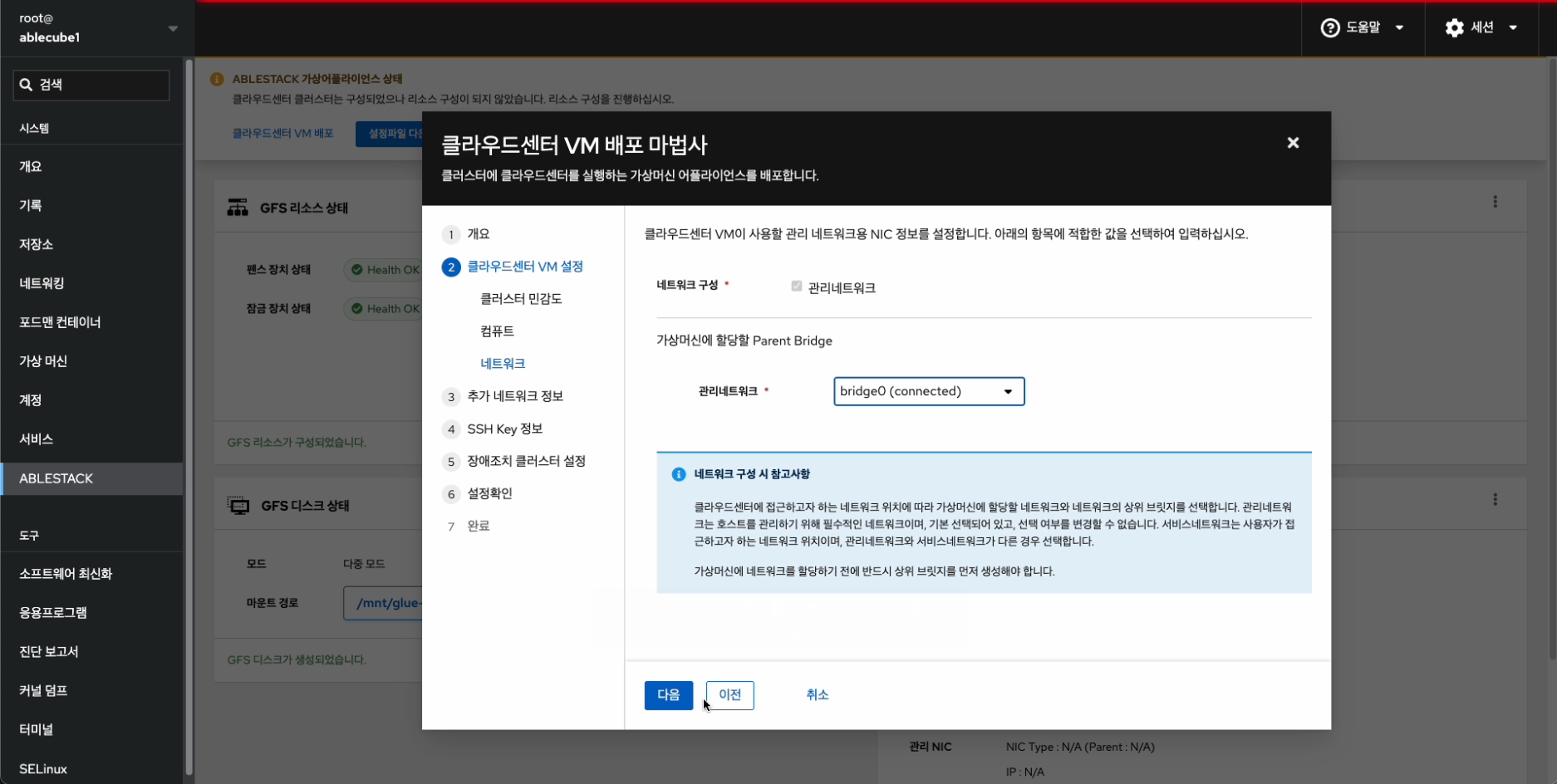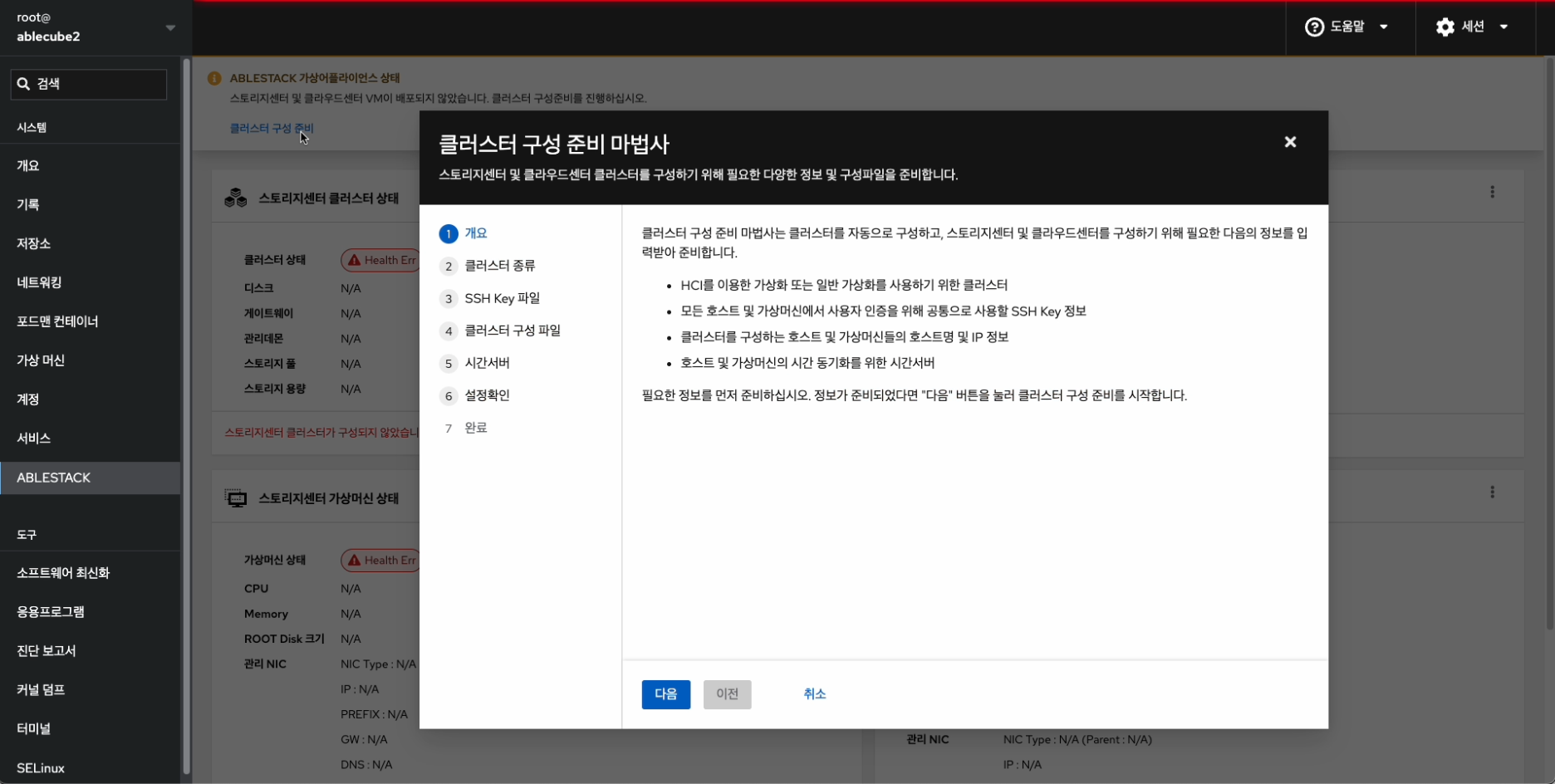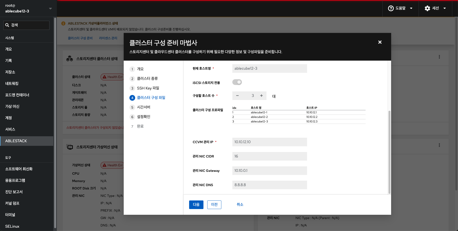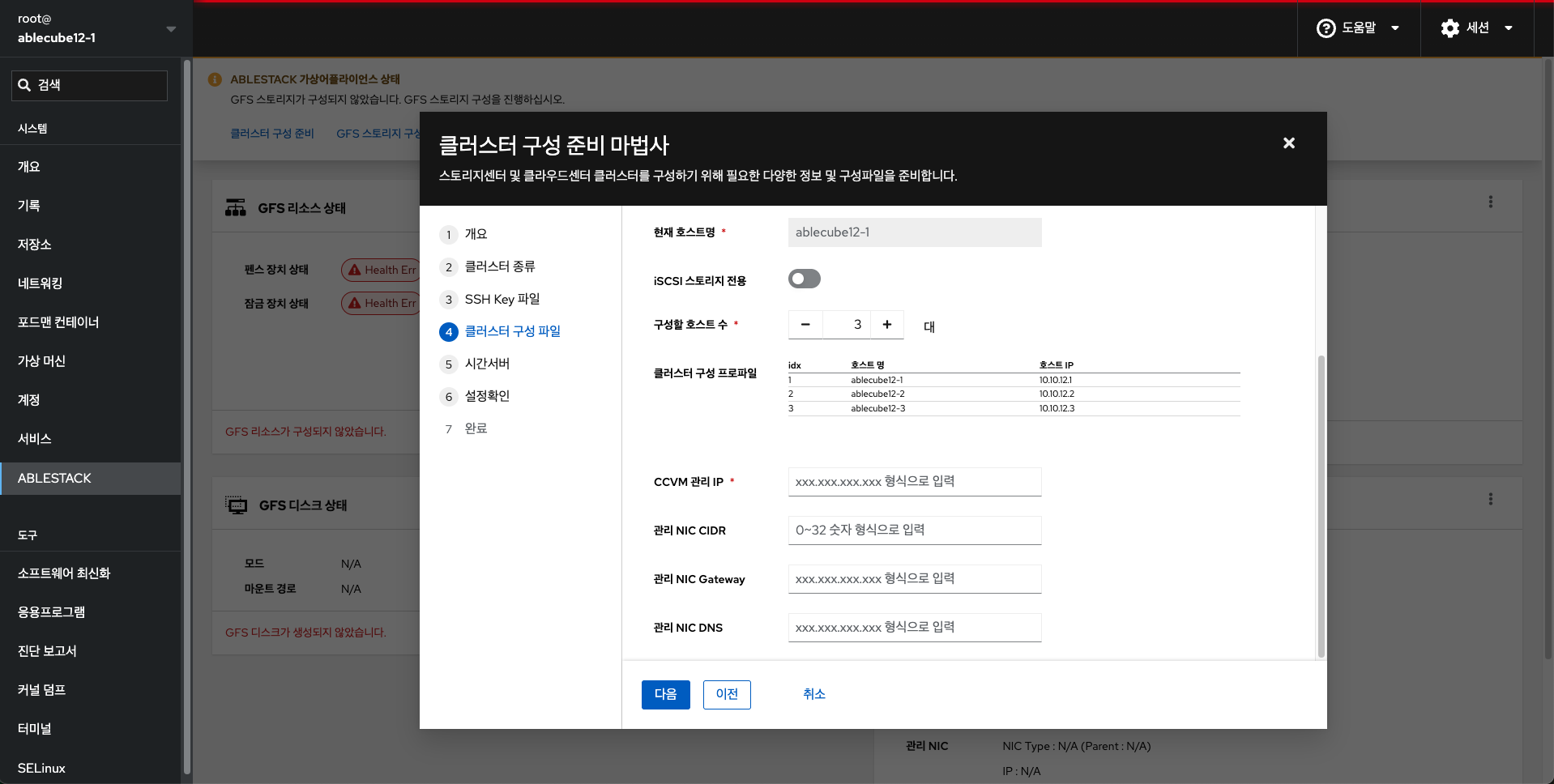 - ABLESTACK VM를 구성을 하는데 필요한 정보를 입력 받아 클러스터 구성을 준비하는 마법사 화면입니다.