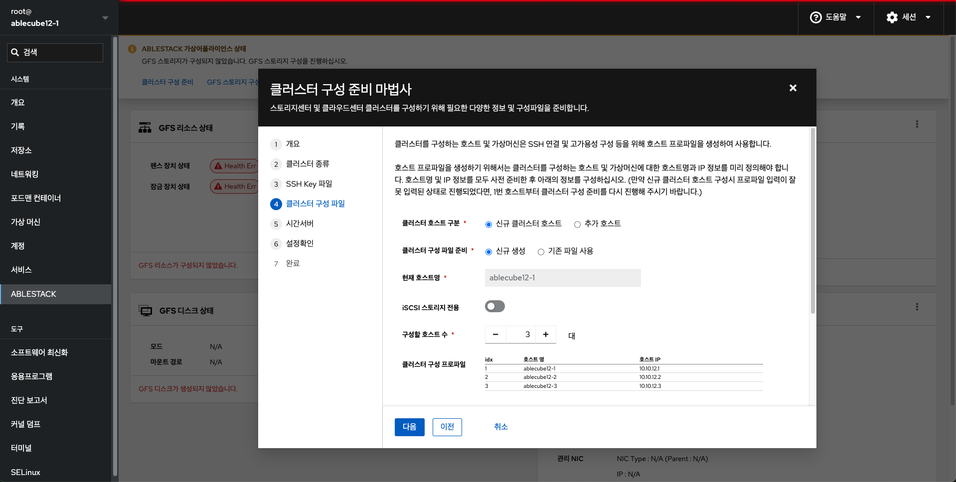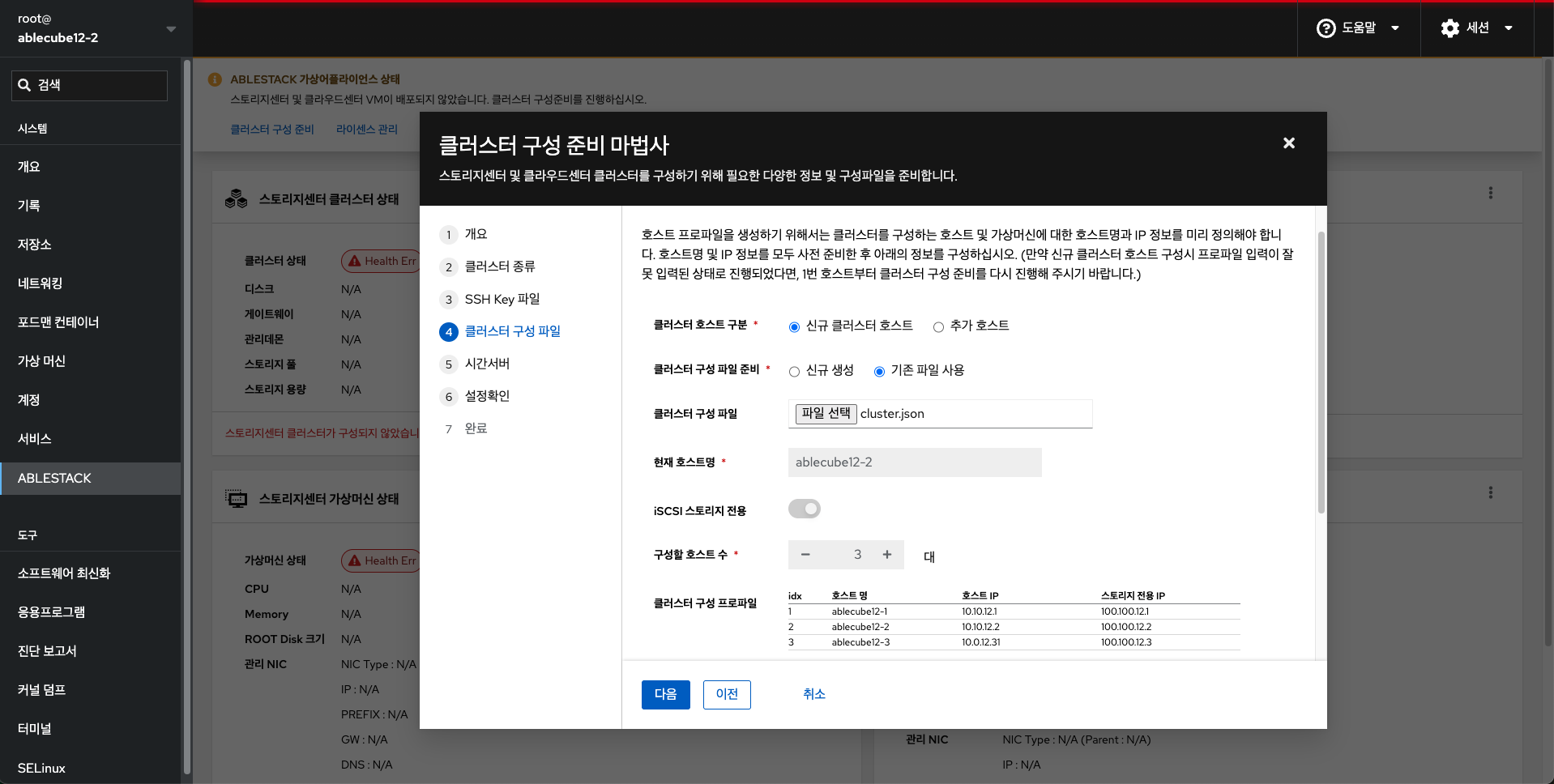 - 클러스터 구성 파일 준비 해당 호스트 파일 사용으로 자동 선택되며, ablecube 호스트 설정 정보를 자동으로 읽어와 클러스터 구성 정보 및 네트워크 IP 정보를 세팅합니다.