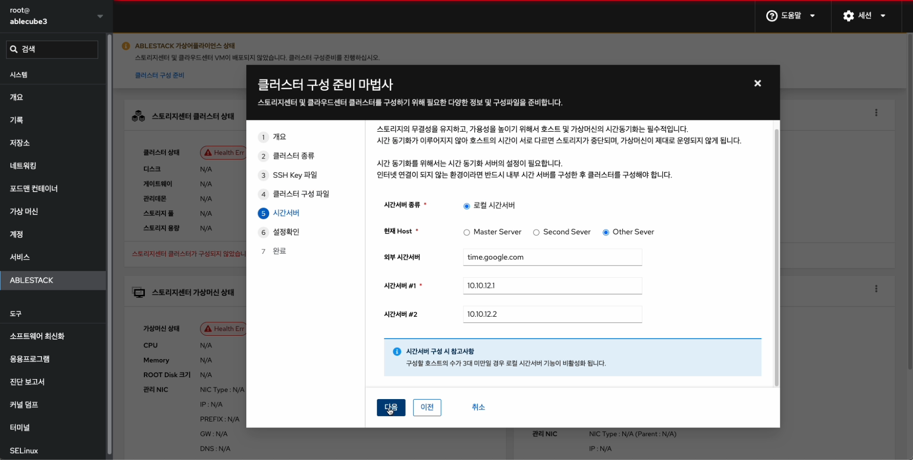 폐쇄적인 네트워크 환경으로 외부 공인된 시간서버와 통신이 불가하고 내부에 별도의 시간서버가 없을 경우에는 ABLESTACK VM애서 자체적으로 시간서버를 구성합니다.- 시간 서버 구성하는 화면입니다.
