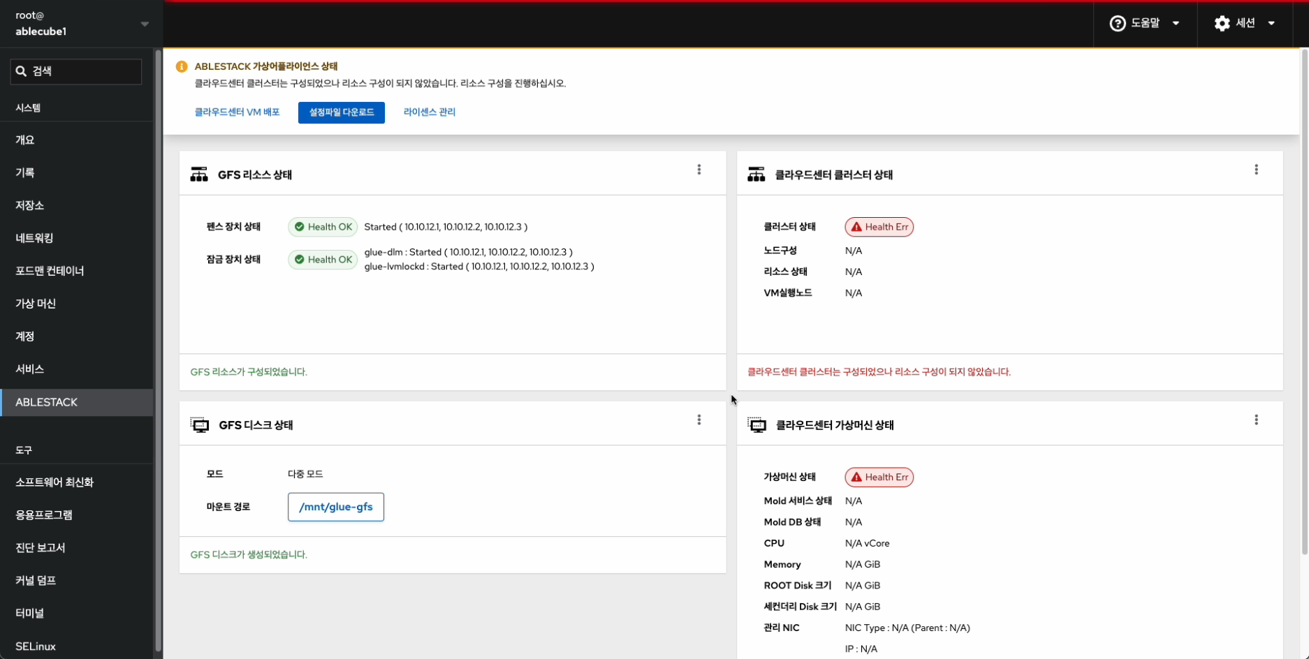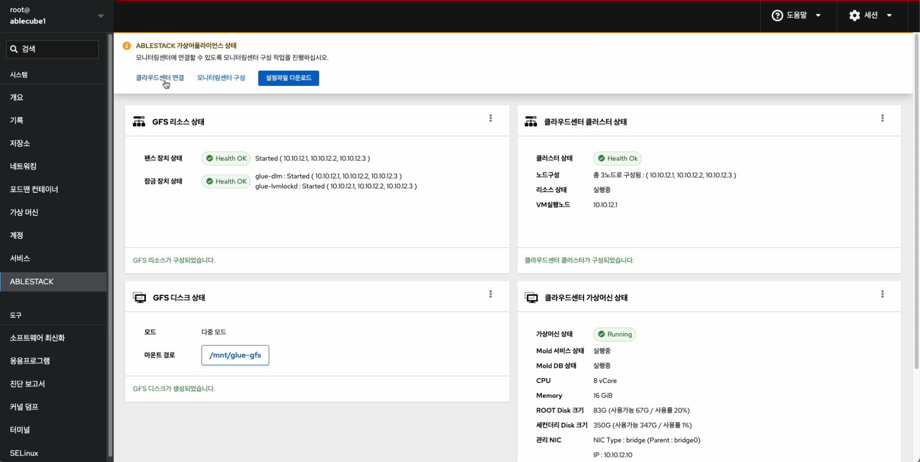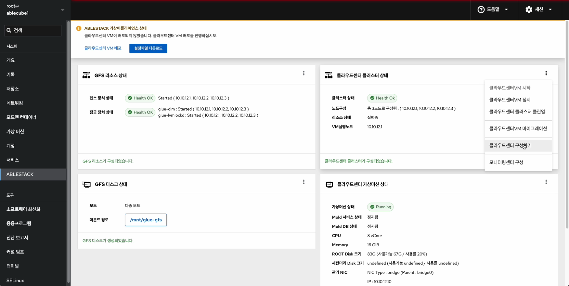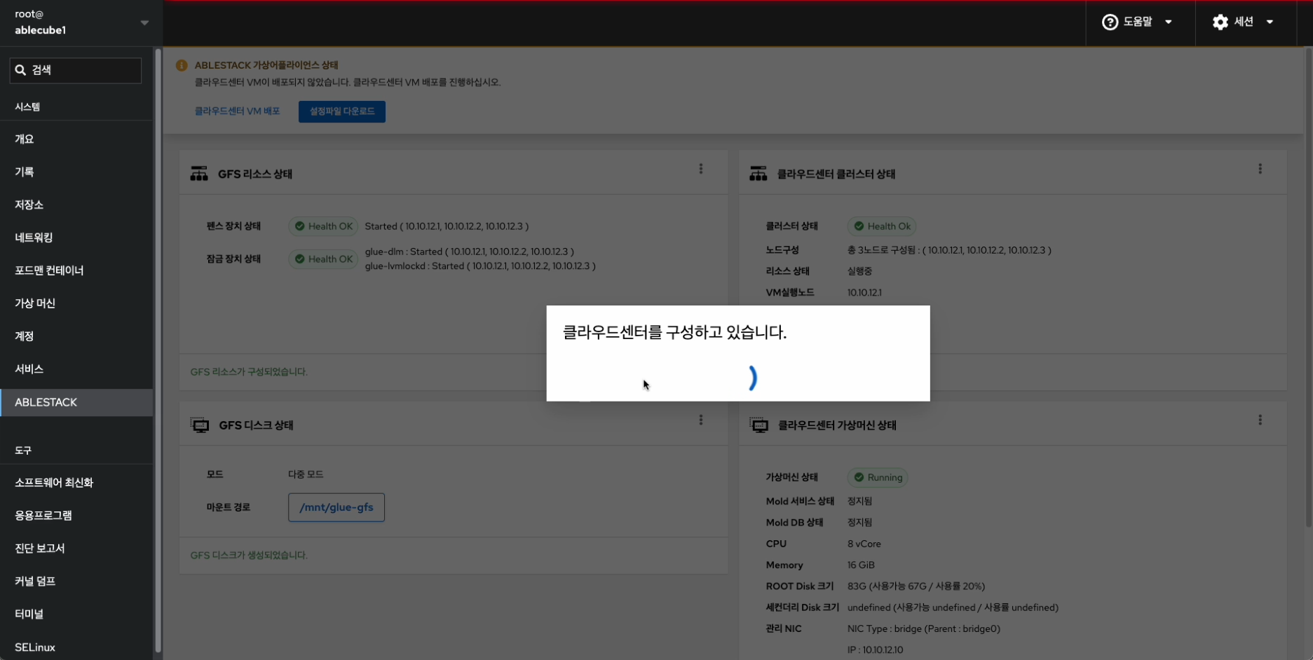 - 클라우드센터 가상머신 배포가 완료 후 ABLESTACK VM Cube 웹콘솔에서 클라우드센터 클러스터 상태 카드 항목에서 클러스터 상태 가 Health Ok, 클라우드센터 가상머신 상태 카드에서 가상머신상태 가 Running 인지 확인하셔야 합니다.