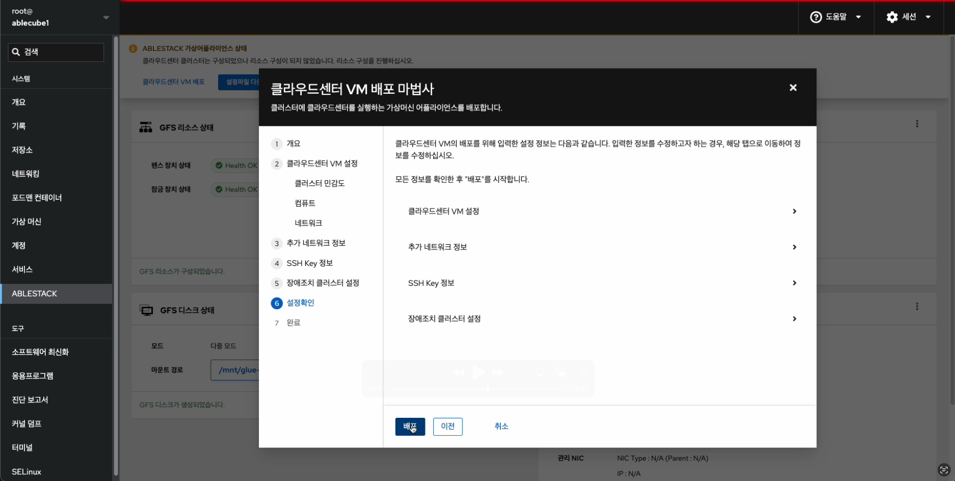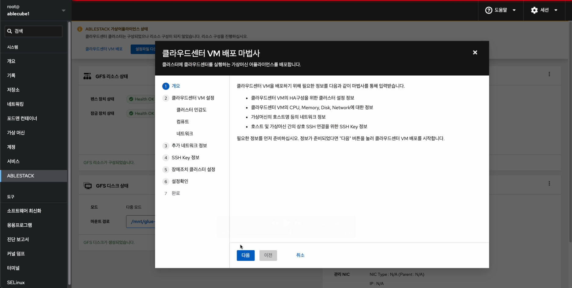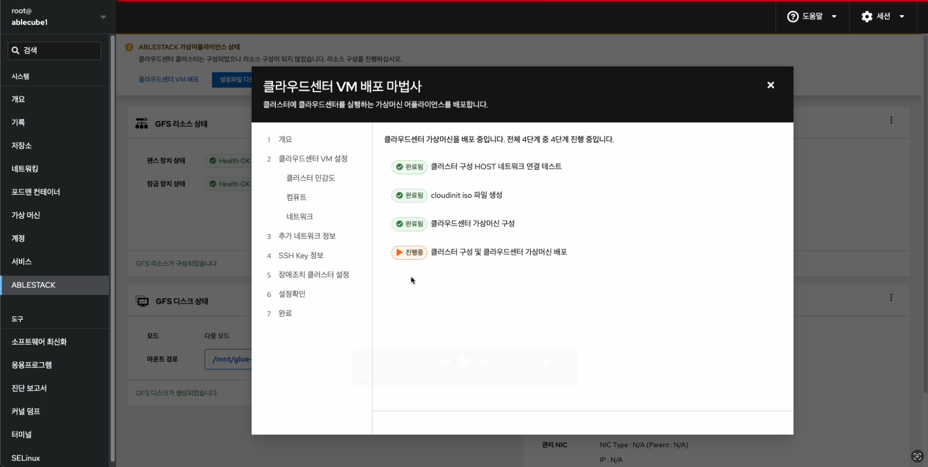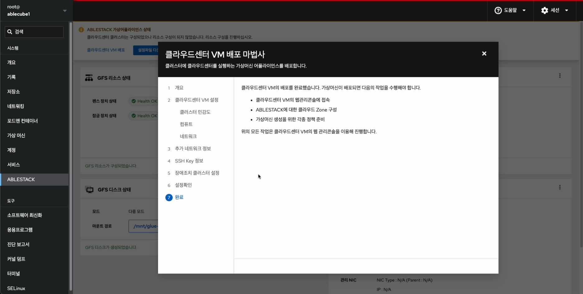 - 클라우드센터 가상머신 배포가 완료 후 ABLESTACK VM Cube 웹콘솔에서 클라우드센터 클러스터 상태 카드 항목에서 클러스터 상태 가 Health Ok, 클라우드센터 가상머신 상태 카드에서 가상머신상태 가 Running 인지 확인하셔야 합니다.
