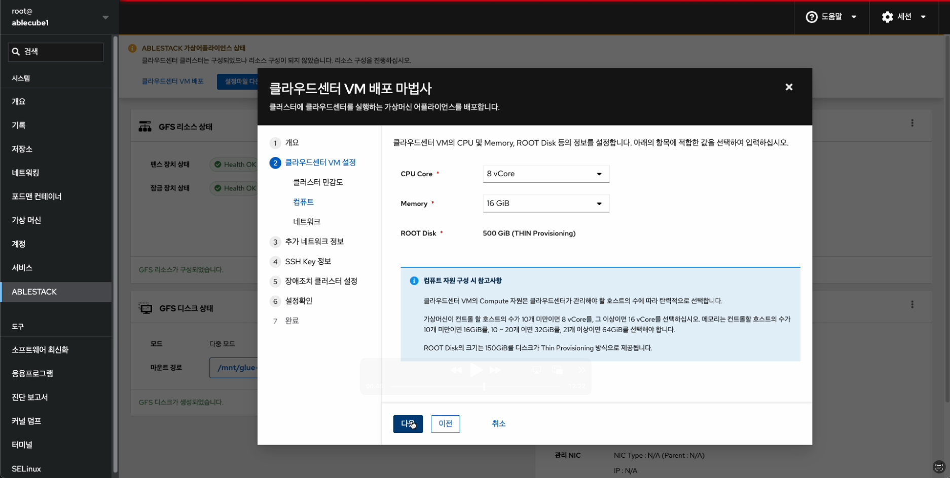 클라우드센터 가상머신의 성능 안정화를 위해 클라우드센터 가상머신(최소 16GB) + 여유 용량 (A) 가 필요합니다.