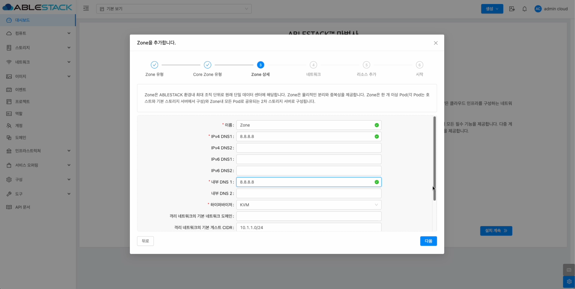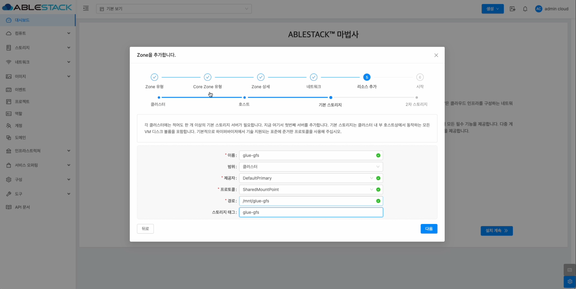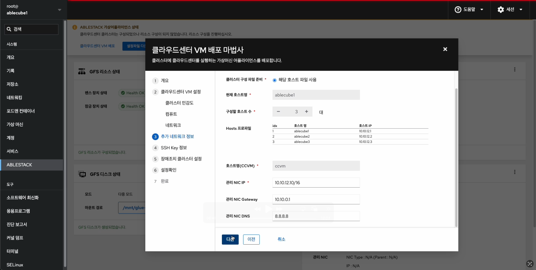 - ABLESTACK VM 구성을 하는데 필요한 정보를 입력 받아 클러스터 구성을 준비하는 마법사 화면입니다.
