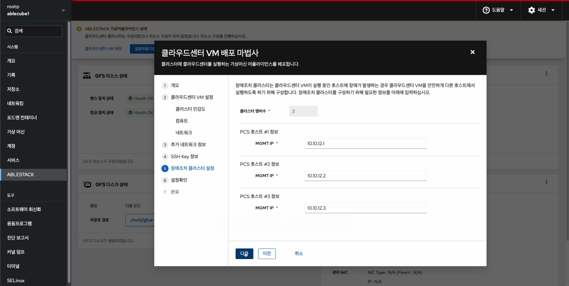 클라우드센터 장애조치 클러스터는 최대 3개의 호스트를 지정할 수 있습니다.