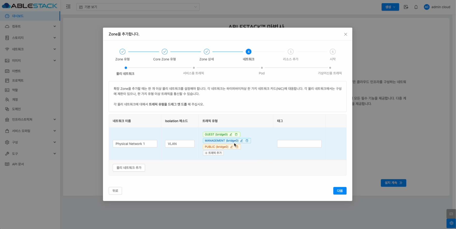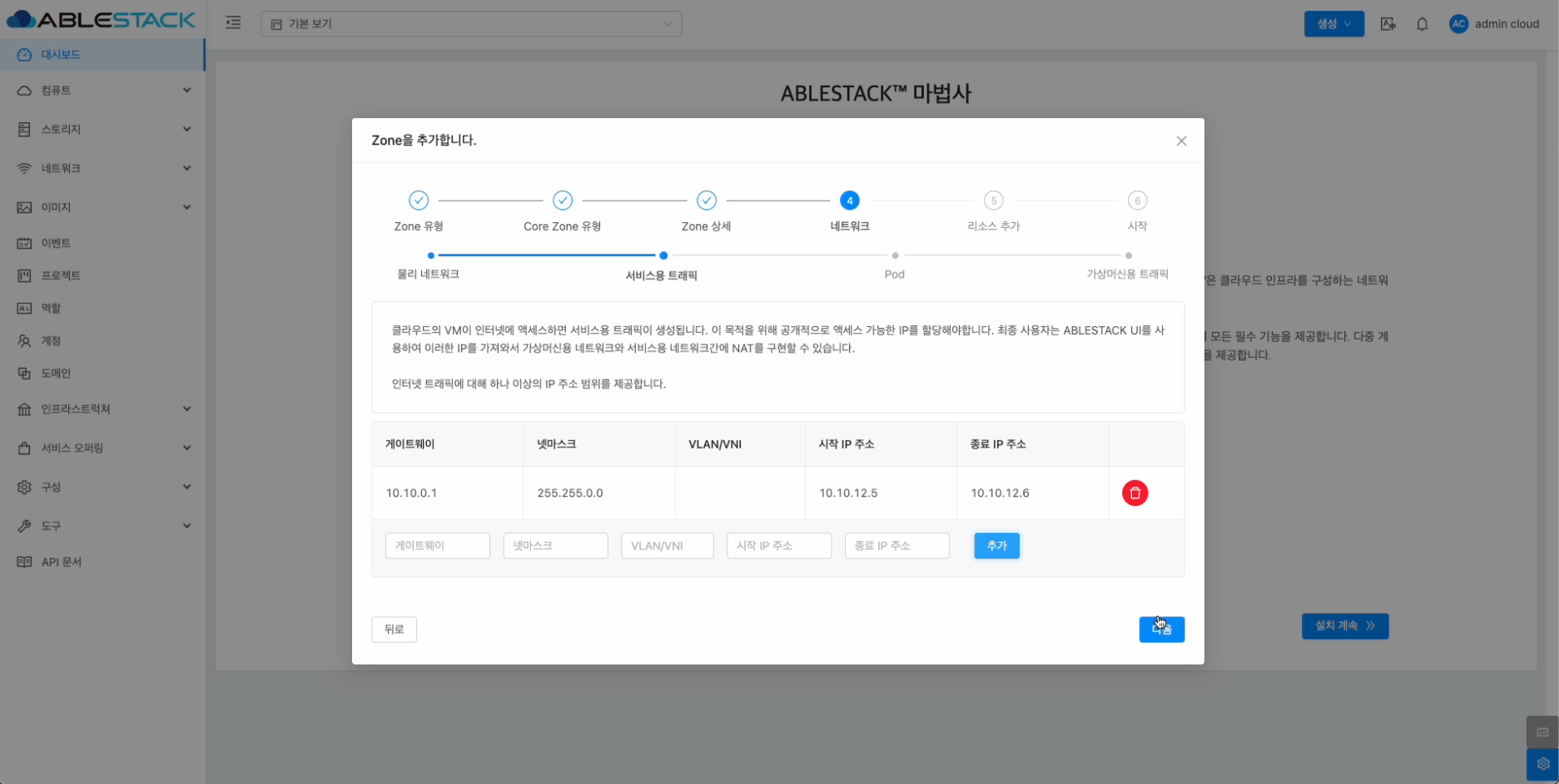 - Zone 의 서비스용 네트워크 정보를 입력 하는 화면입니다.