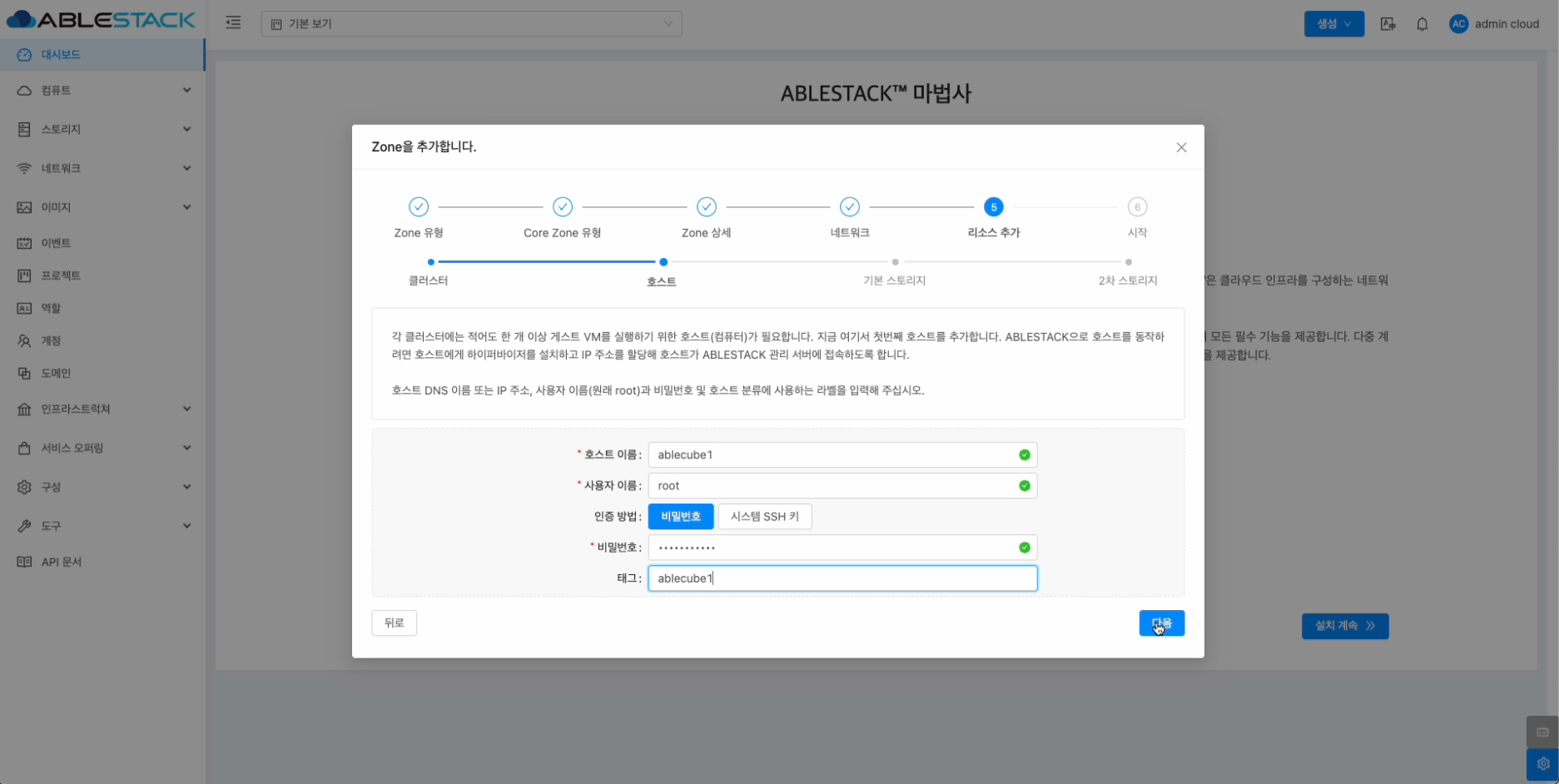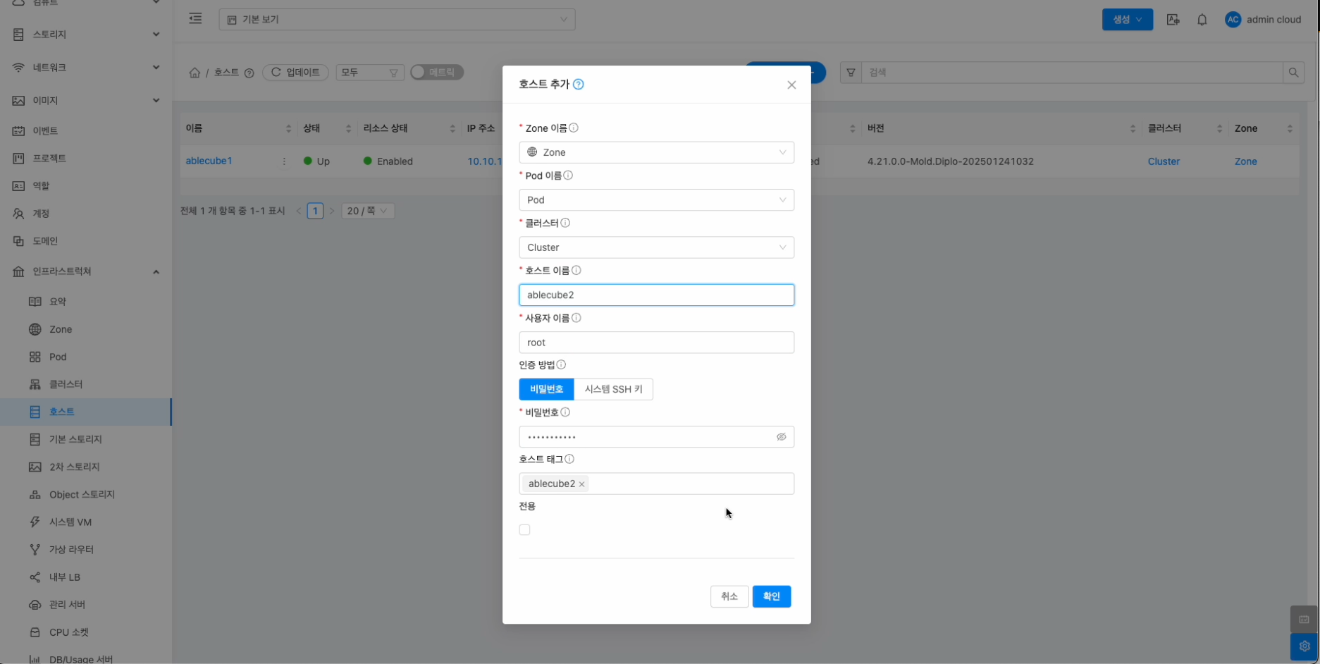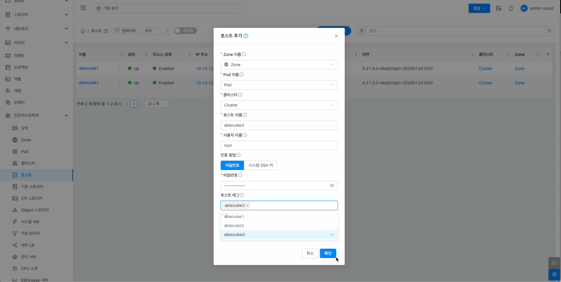 - 클라우드센터 ablecube2 호스트를 추가하는 화면 입니다.