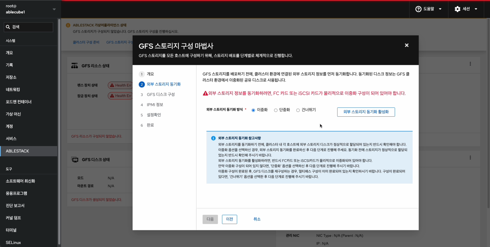 건너뛰기 - 외부 스토리지 방식(이중화 또는 단중화) 구성을 마친 뒤 GFS 대상 디스크를 잘못 선택하셨다면, 외부 스토리지 동기화 단계에서 건너뛰기를 눌러 해당 단계를 건너뛸 수 있습니다.