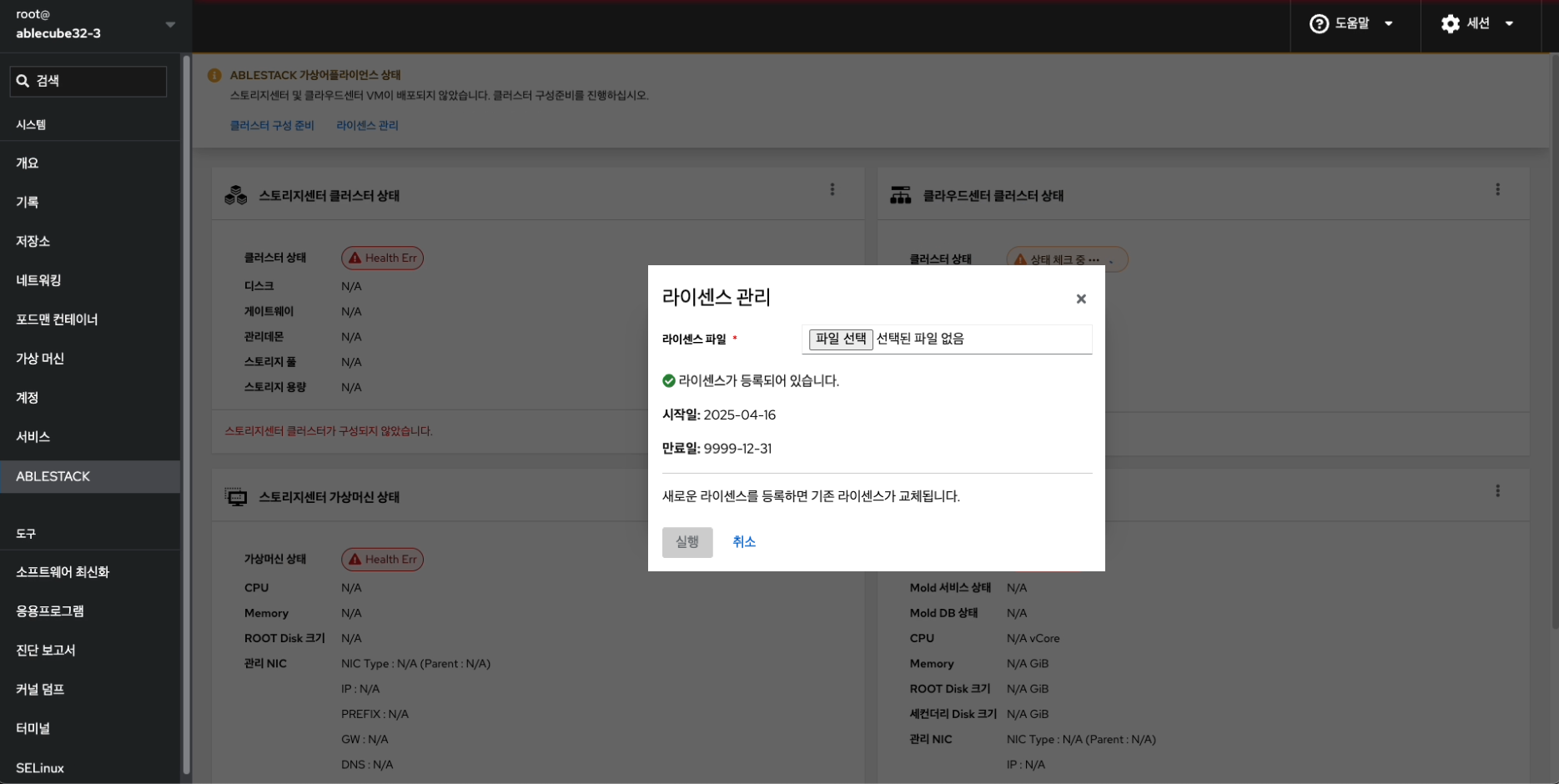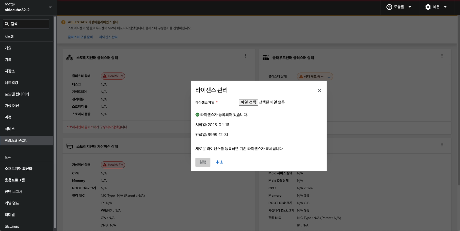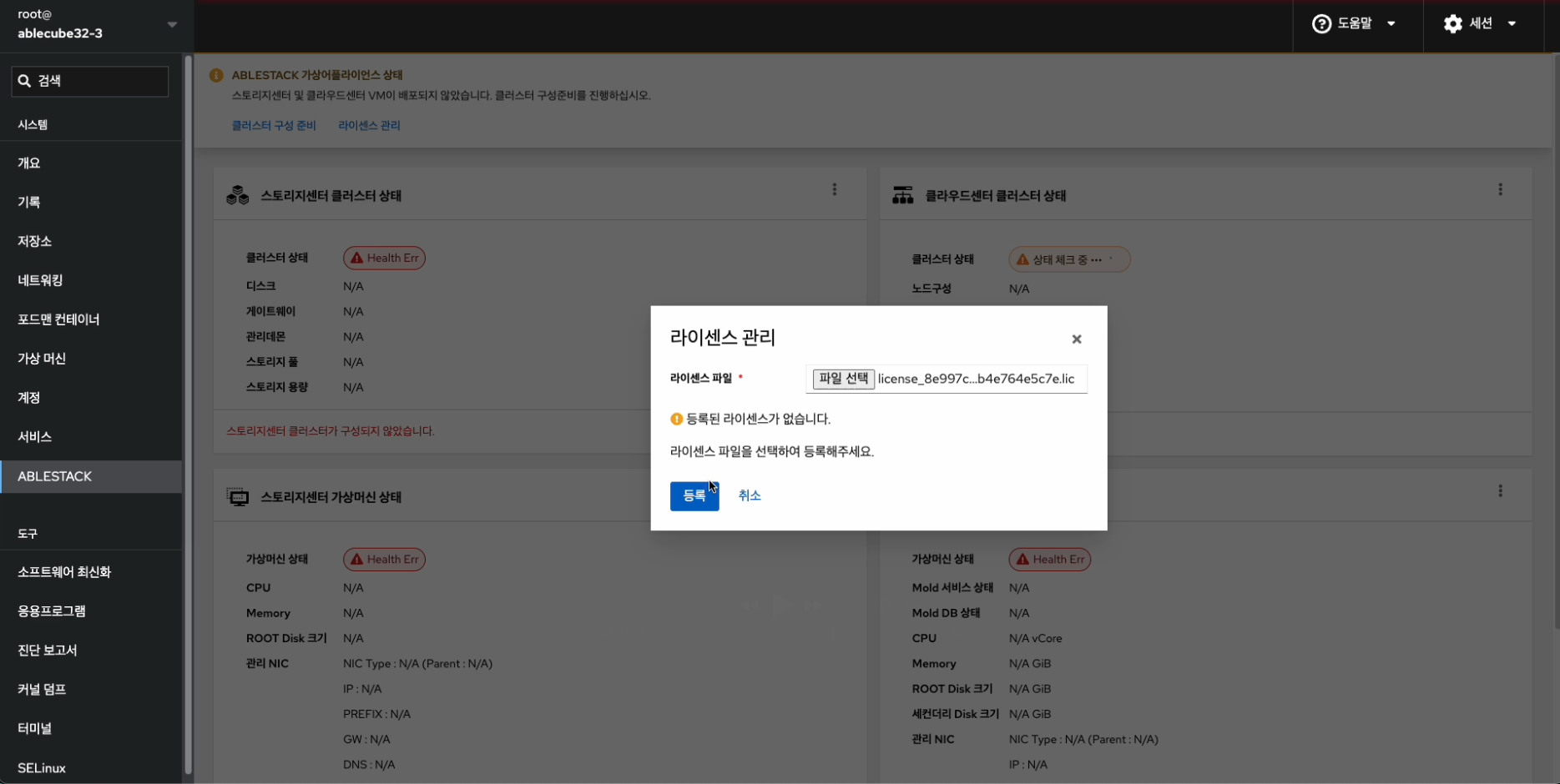 라이선스를 등록하기 위해서는 ABLECLOUD로부터 발급된 라이선스 파일이 필요합니다. 라이선스 관련 문의 사항은 ABLECLOUD 고객 지원 번호 및 이메일로 문의해 주시기 바랍니다.