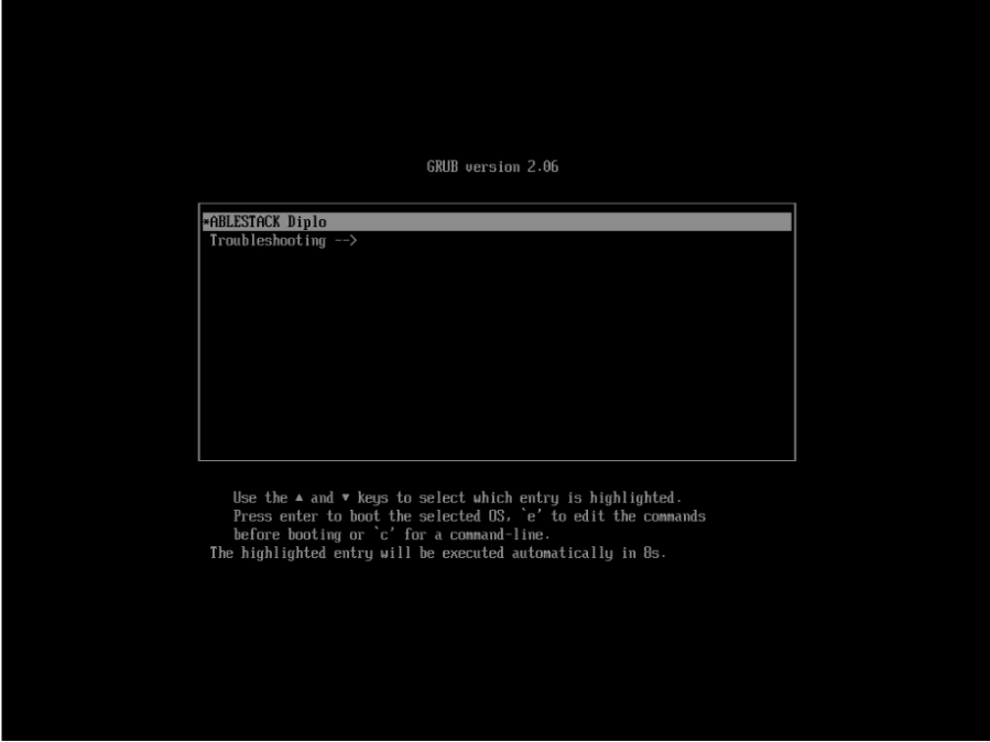 화면에서 Install ABLESTACK Diplo 메뉴가 보이는지 확인해야 합니다. 해당 메뉴가 보이면 ABLESTACK STANDALONE Cube 정상적으로 설치를 하실 수 있습니다.