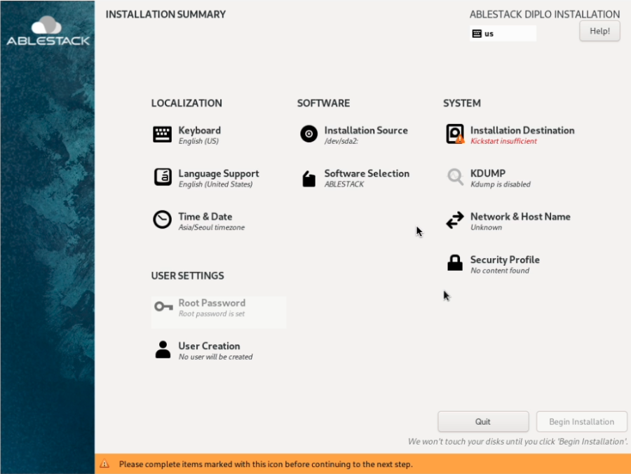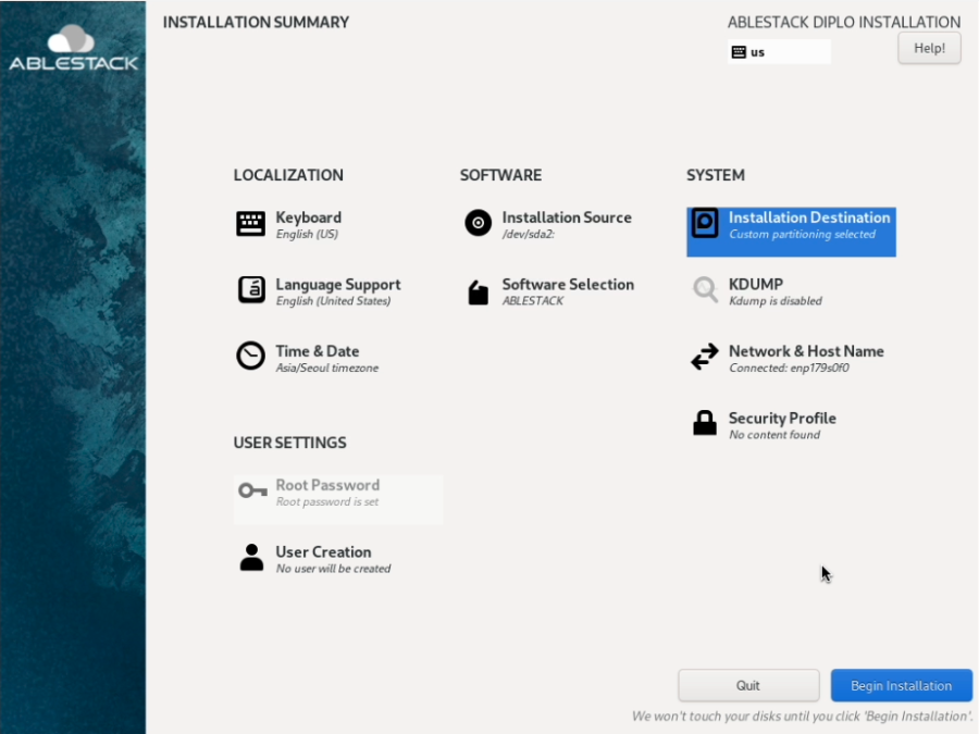 ABLESTACK STANDALONE Cube는 기본적인 정보는 자동으로 설정이 되어 있습니다. Installation Destination, Network & Host name 항목에 대해서만 설정하면 됩니다.
