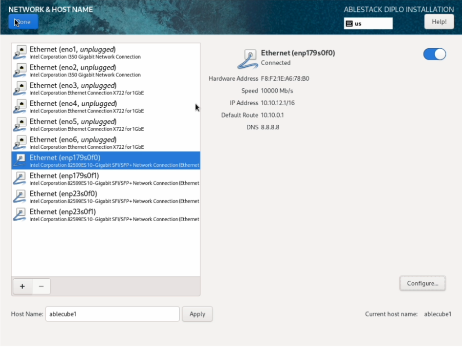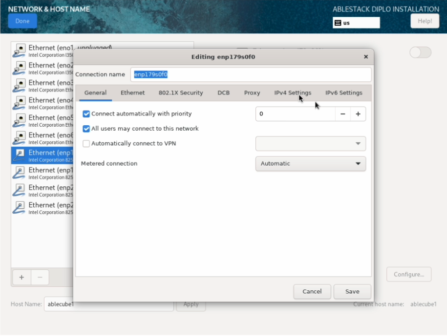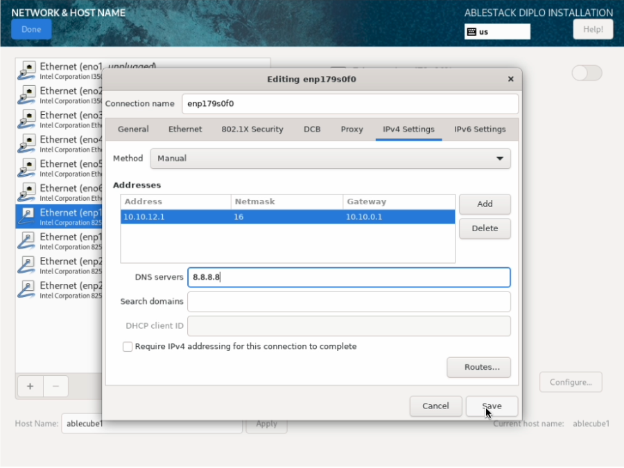 ABLESTACK STANDALONE Cube 구성화면에서 Network & Host Name 을 클릭하면 해당 화면으로 이동됩니다.
