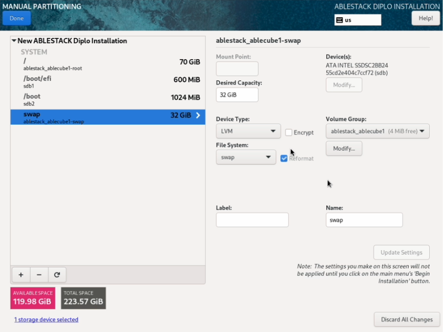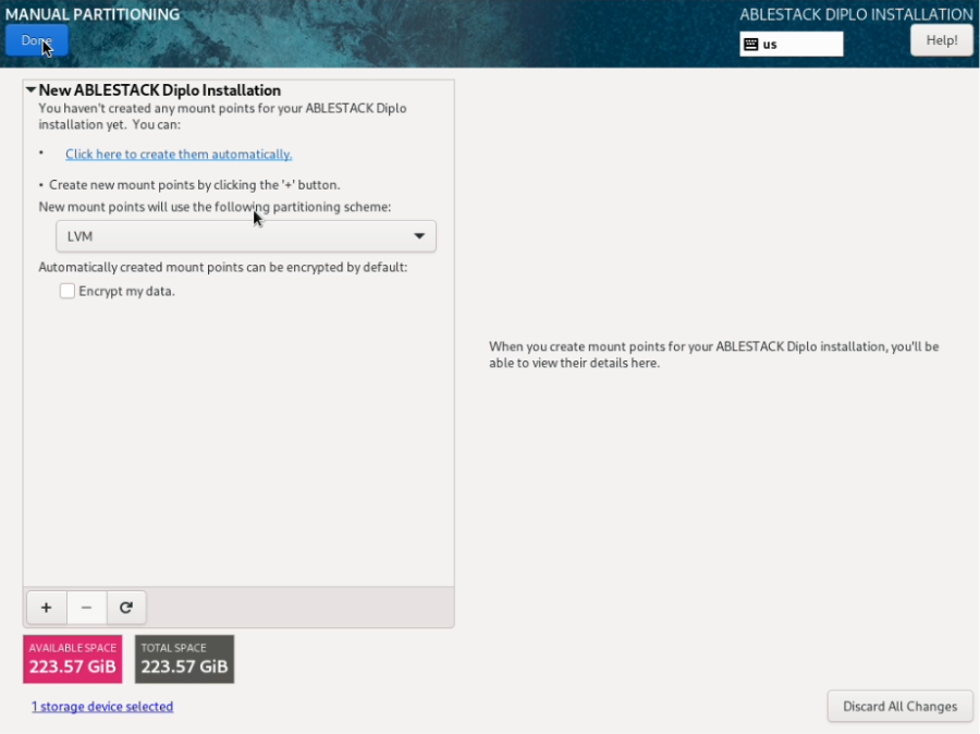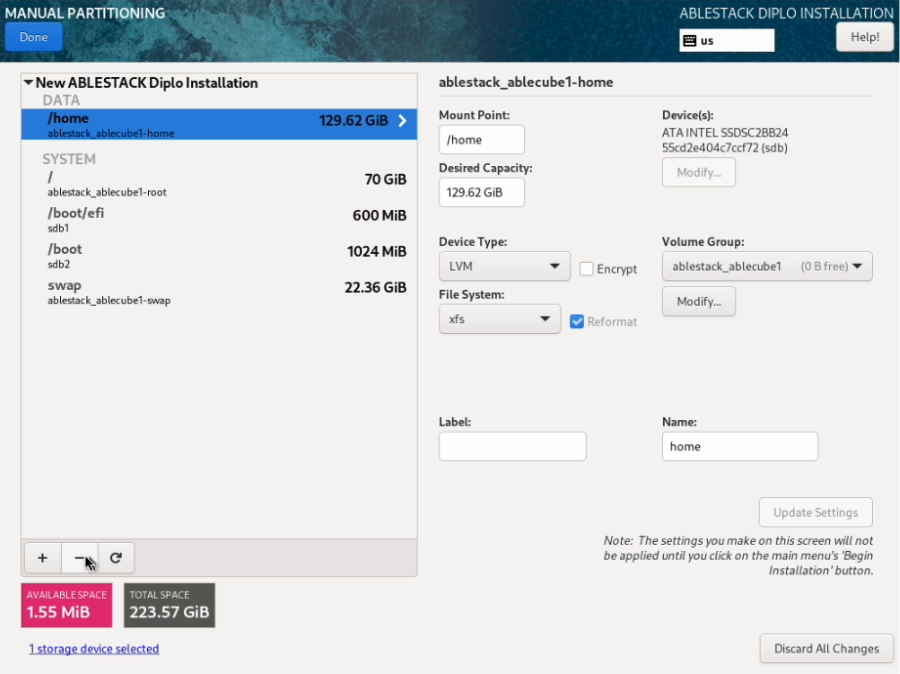 - ABLESTACK STANDALONE Cube 구성화면에서 Installation Destination 을 클릭하면 해당 화면으로 이동됩니다.