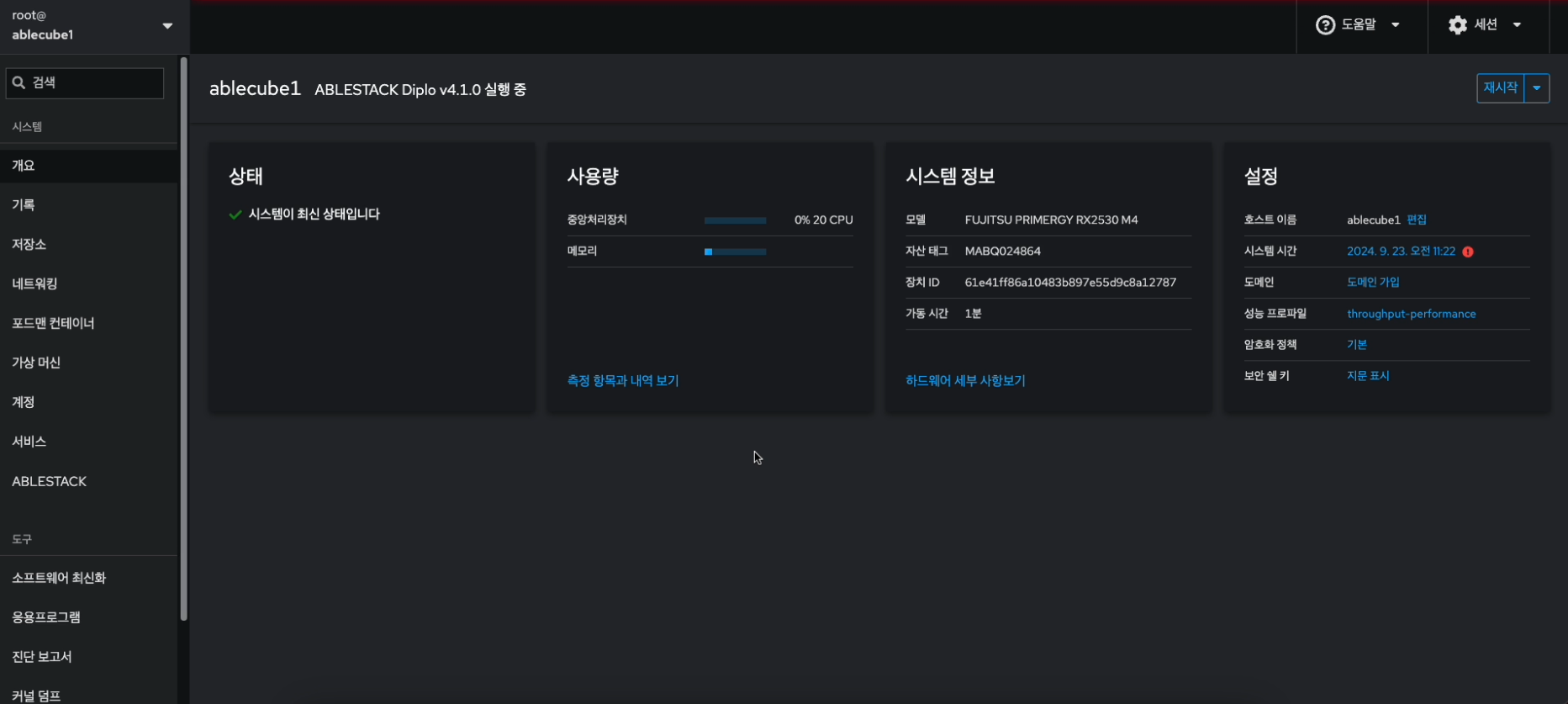 일반적으로 호스트명은 "ablecube23"과 같이 ablecube + 넘버링 형태로 지정하면 향후 관리가 용이합니다.