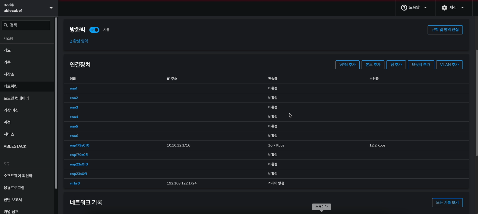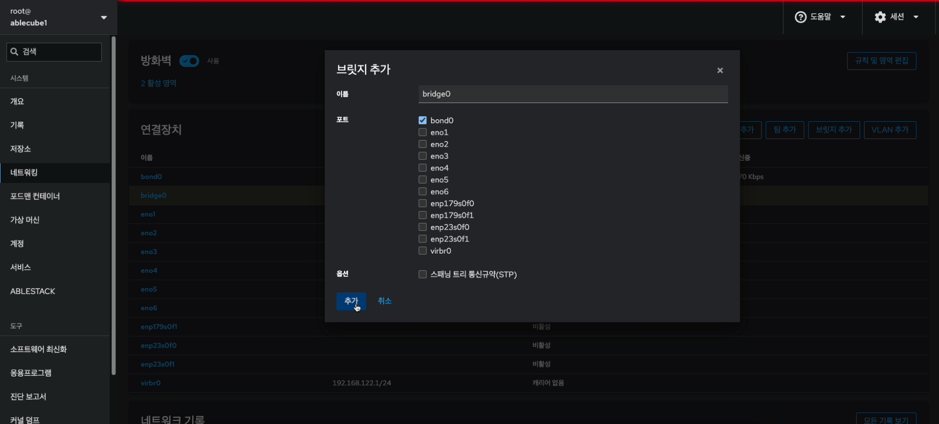 해당 화면에서 방화벽 설정 및 본드(bond), 브릿지(bridge), VLAN 구성을 진행합니다.