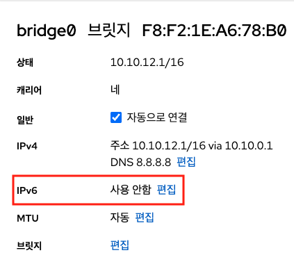 본드(bond) 구성이 필요한 경우에는 먼저 본드(bond) 구성을 완료한 뒤 브릿지(bridge)를 생성해 사용해야 합니다. 이때 브릿지 설정에서 IPv6 활성화 항목은 반드시 사용 안함 으로 설정해야 합니다.