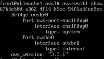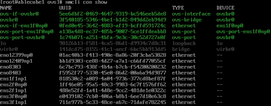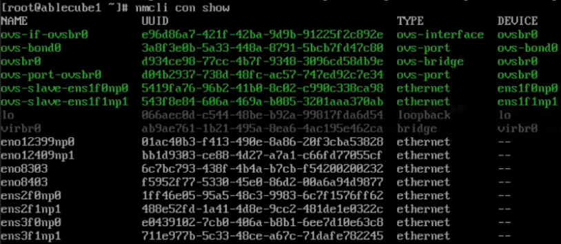 # 1. OpenvSwitch 관련 RPM 패키지 설치 (전체 호스트 실행) dnf install -y /usr/share/ablestack/ovs/*.rpm # 2. OpenvSwitch 서비스 활성화 및 KVM 기반 Network 서비스 재시작 systemctl enable --now openvswitch systemctl restart NetworkManager단일 OpenvSwitch NIC 구성¶