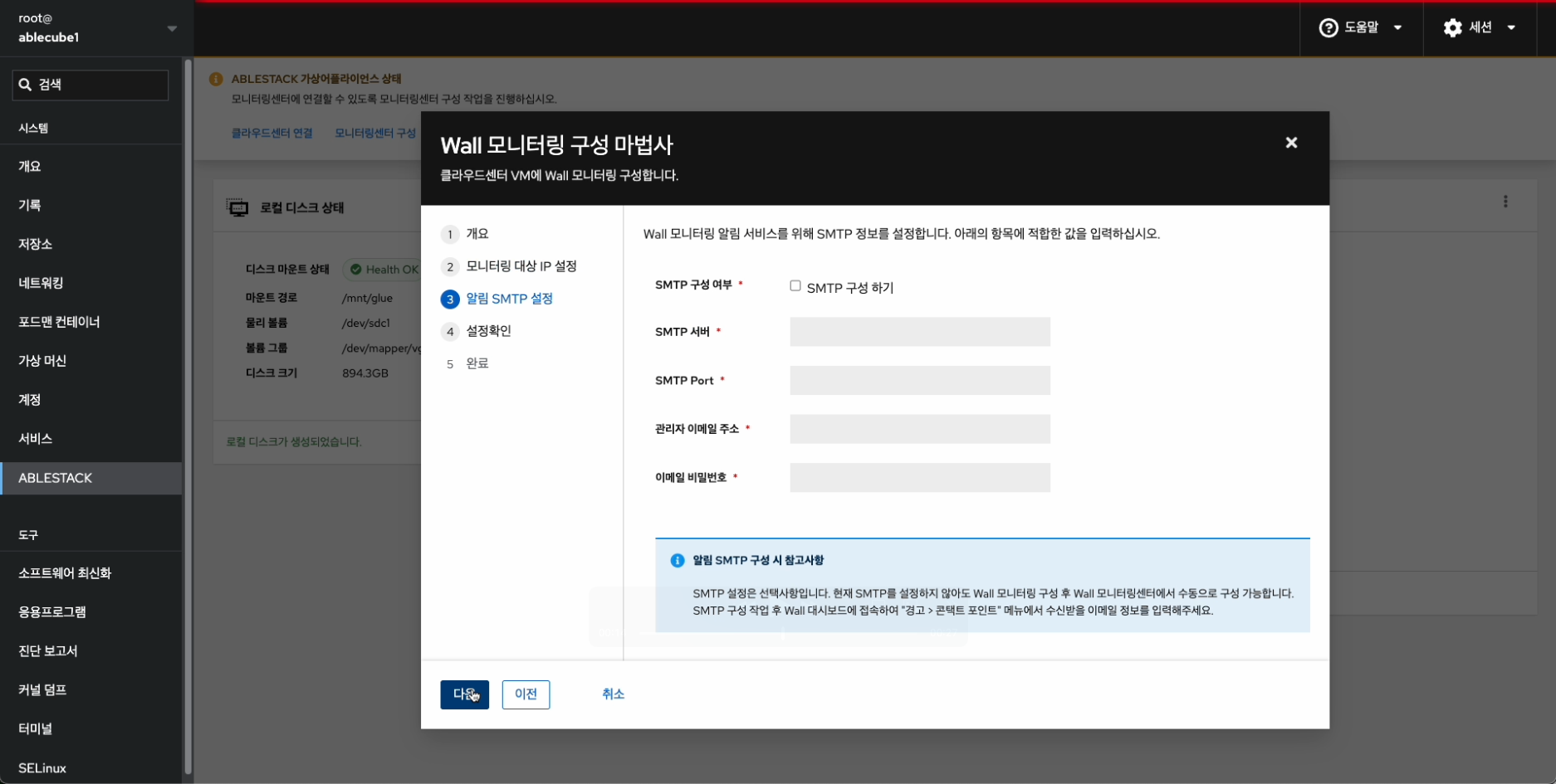 - 알림 SMTP 설정 내용을 입력 후 다음 버튼을 클릭합니다.