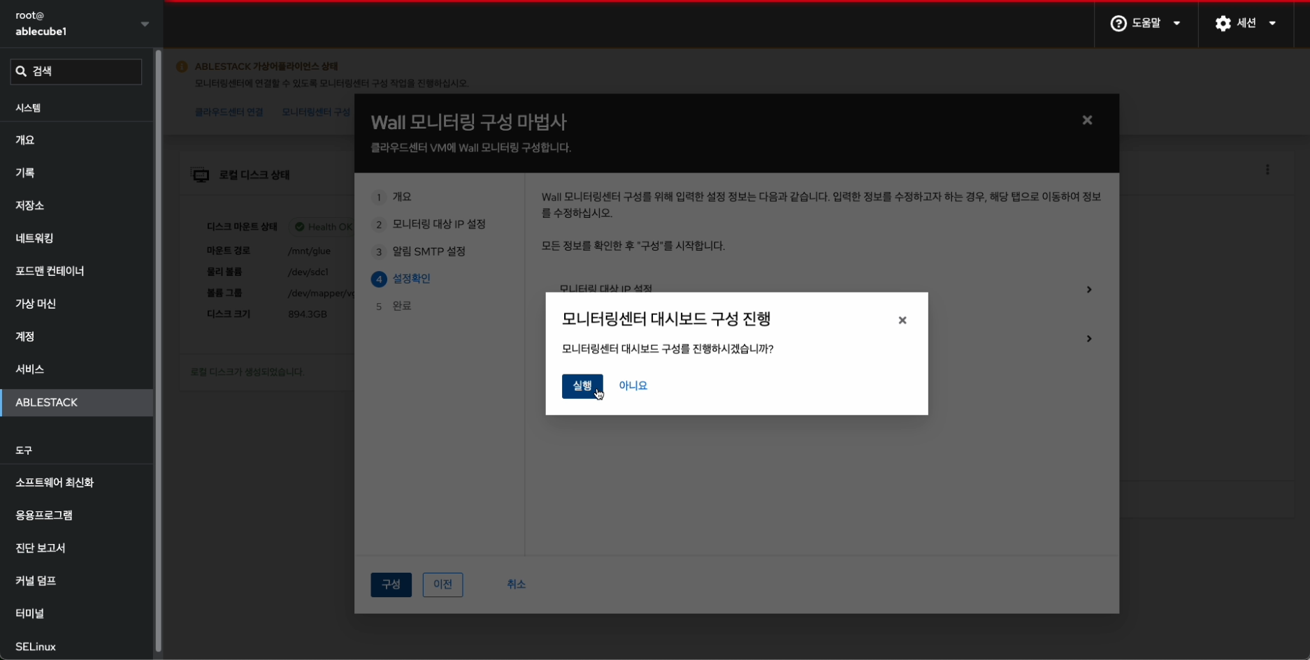 - 실행 버튼을 클릭하여 모니터링센터 구성을 진행합니다.