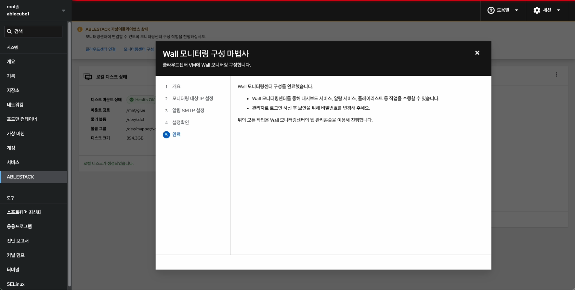 - 모니터링센터 구성 진행 완료 후 화면입니다.
