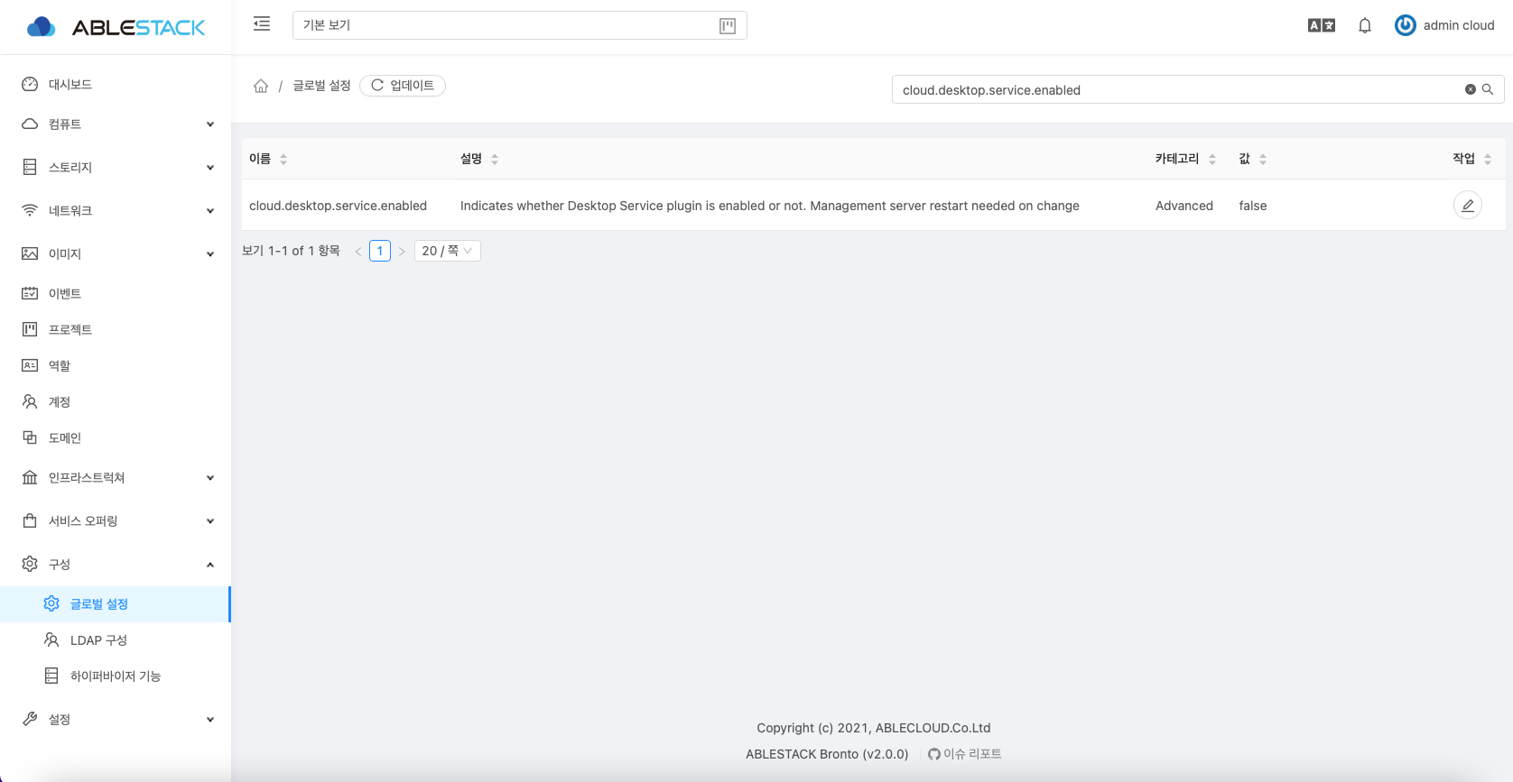 ABLESTACK Works 설치 진행 가이드 입니다. ABLESTACK Mold 의 데스크톱 서비스 를 이용하여 진행이 되며 데스크톱 서비스 메뉴는 Mold > 구성 > 글로벌 설정 에서 cloud.desktop.service.enabled 항목을 true 로 값을 변경 하고 ABLESTACK Mold 를 재시작 하면 데스크톱 서비스 메뉴가 활성화 됩니다.