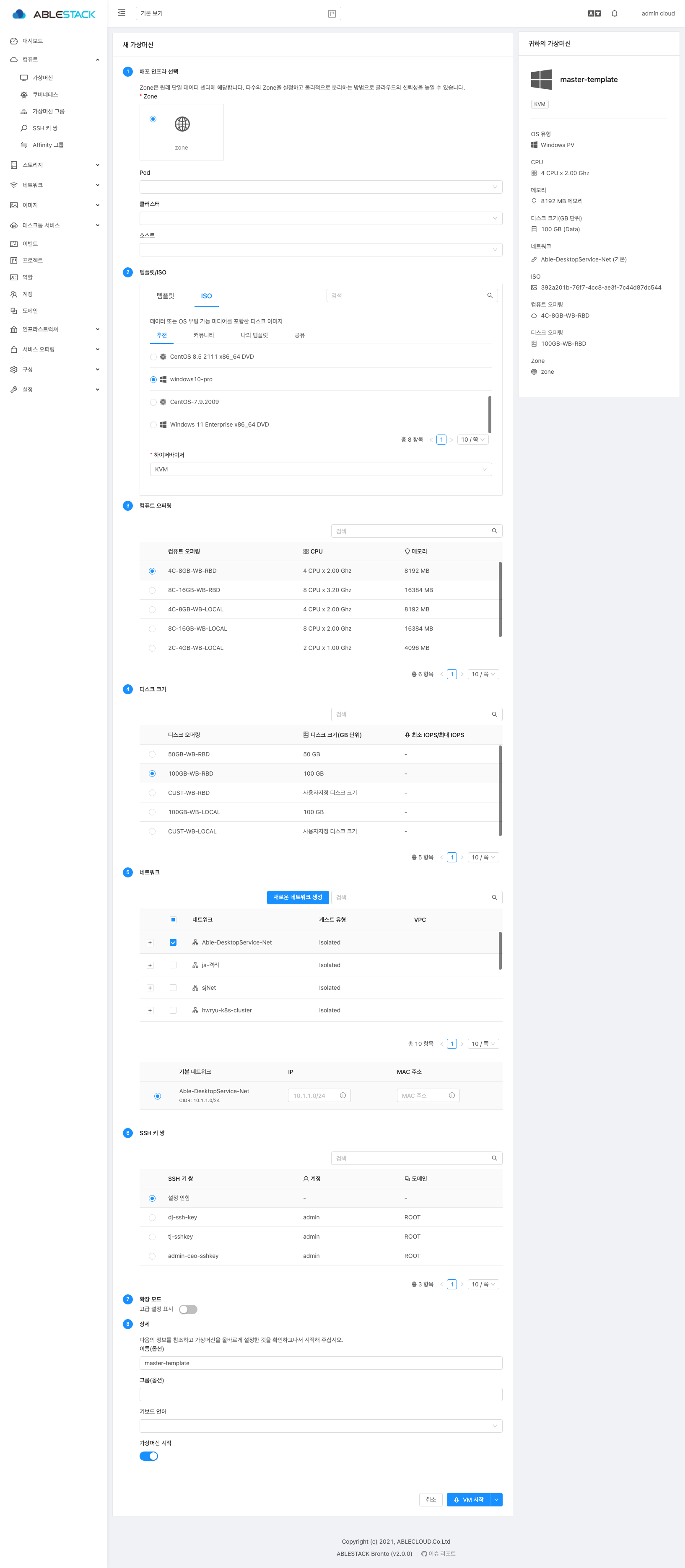 템플릿/ISO : ISO 탭 선택 후 마스터 템플릿으로 설치할 ISO 를 선택 하고, Zone 에서 구성된 하이퍼바이저 를 선택 합니다.