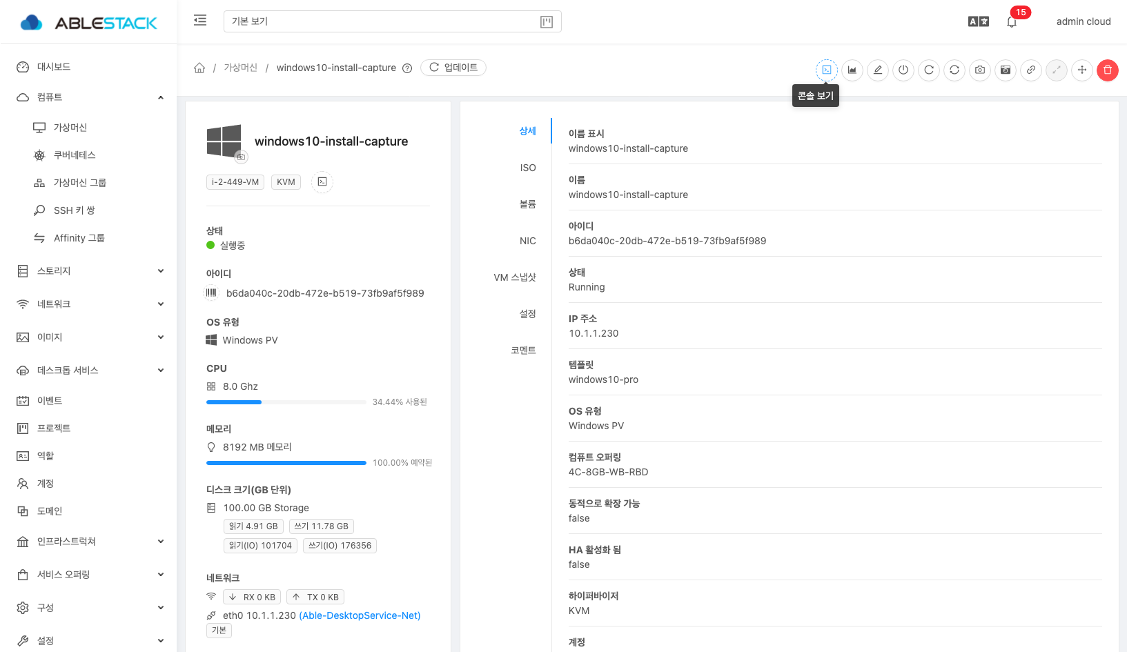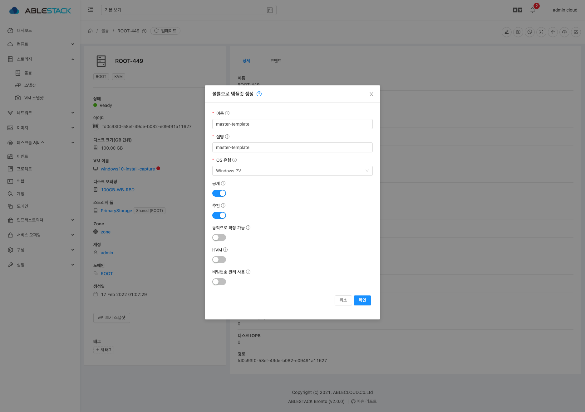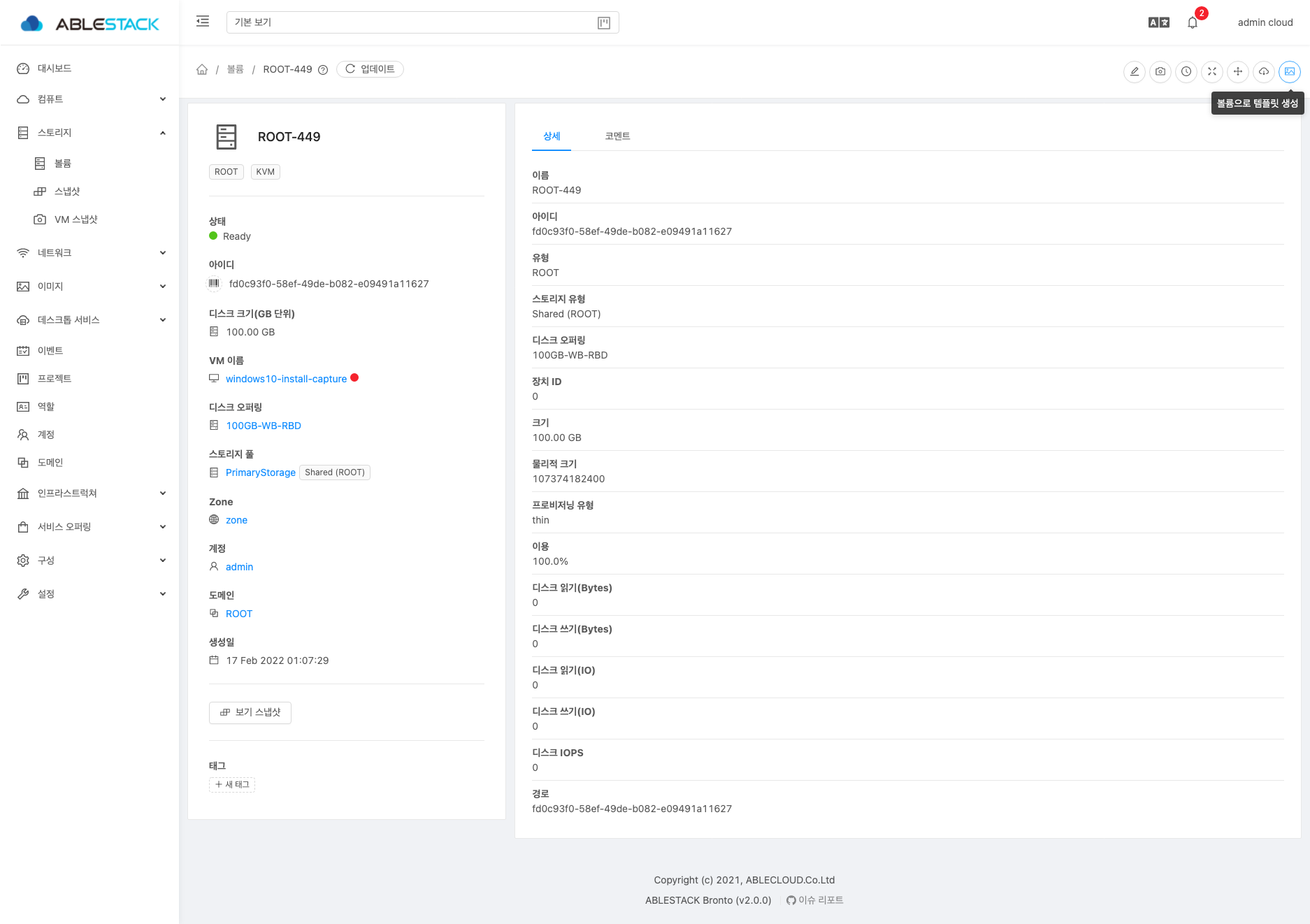 14. 정지된 가상머신의 Disk를 선택하여 상세화면으로 이동하여 템플릿 생성 화면으로 이동합니다.