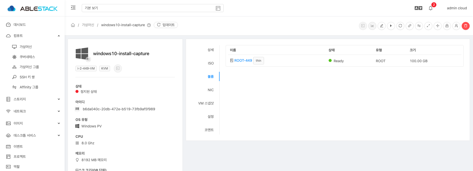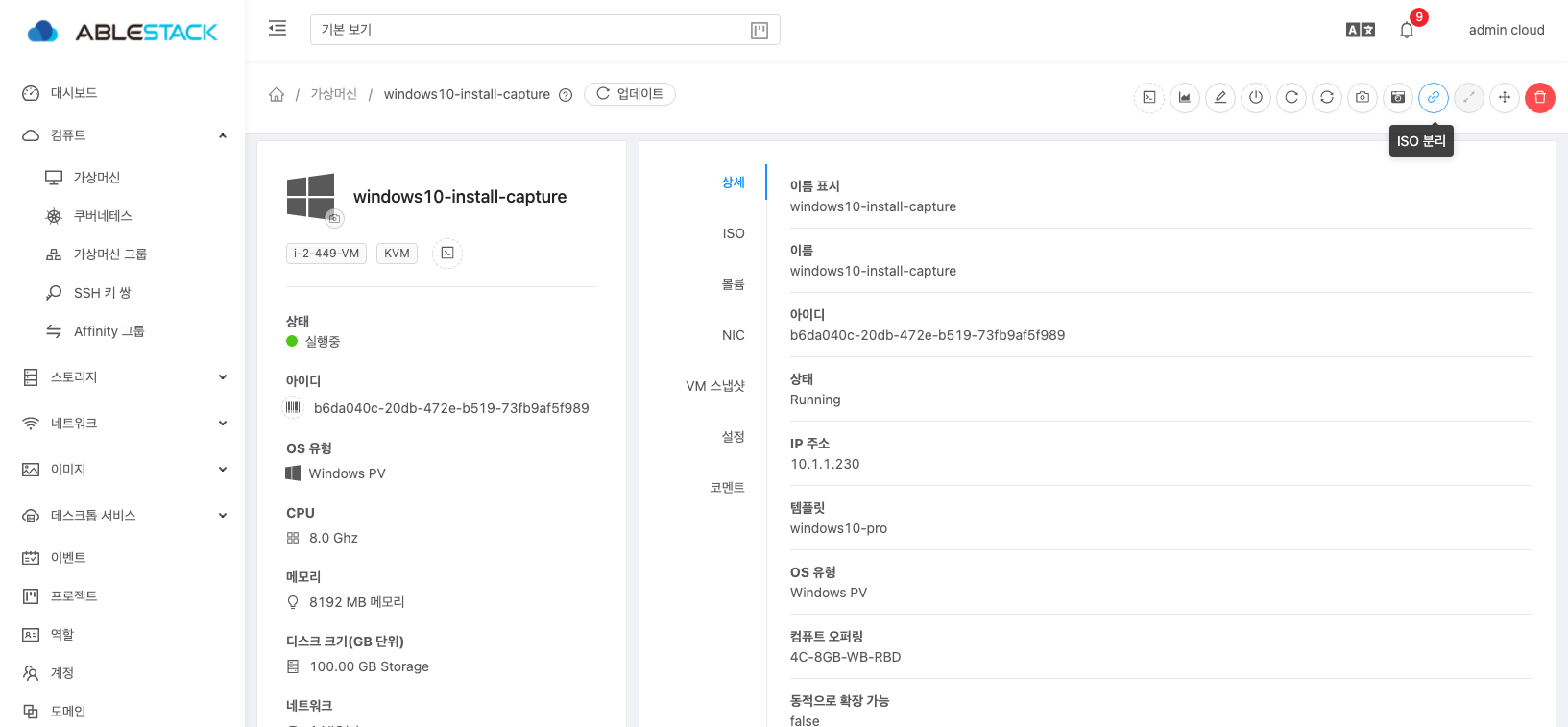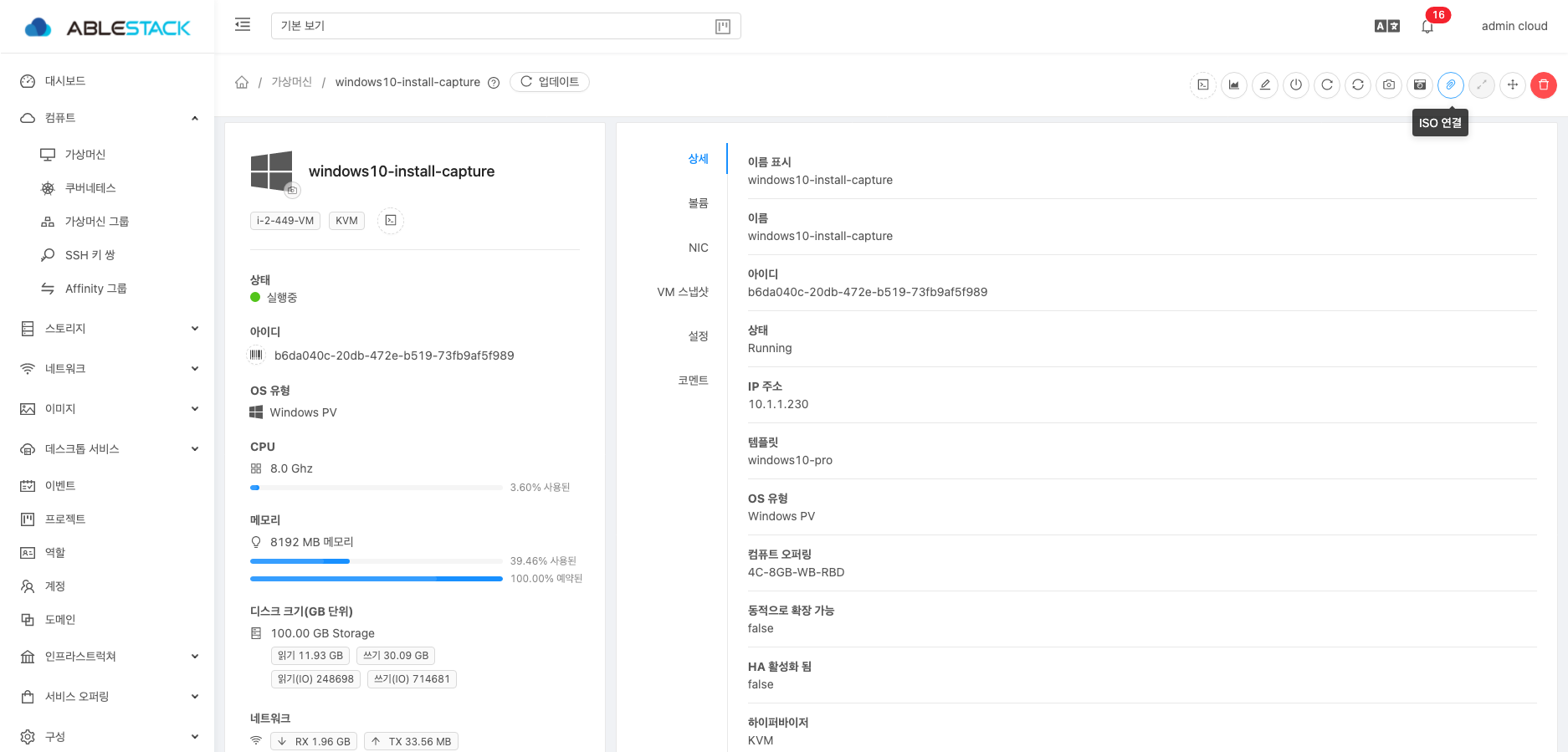 14. 정지된 가상머신의 Disk를 선택하여 상세화면으로 이동하여 템플릿 생성 화면으로 이동합니다.