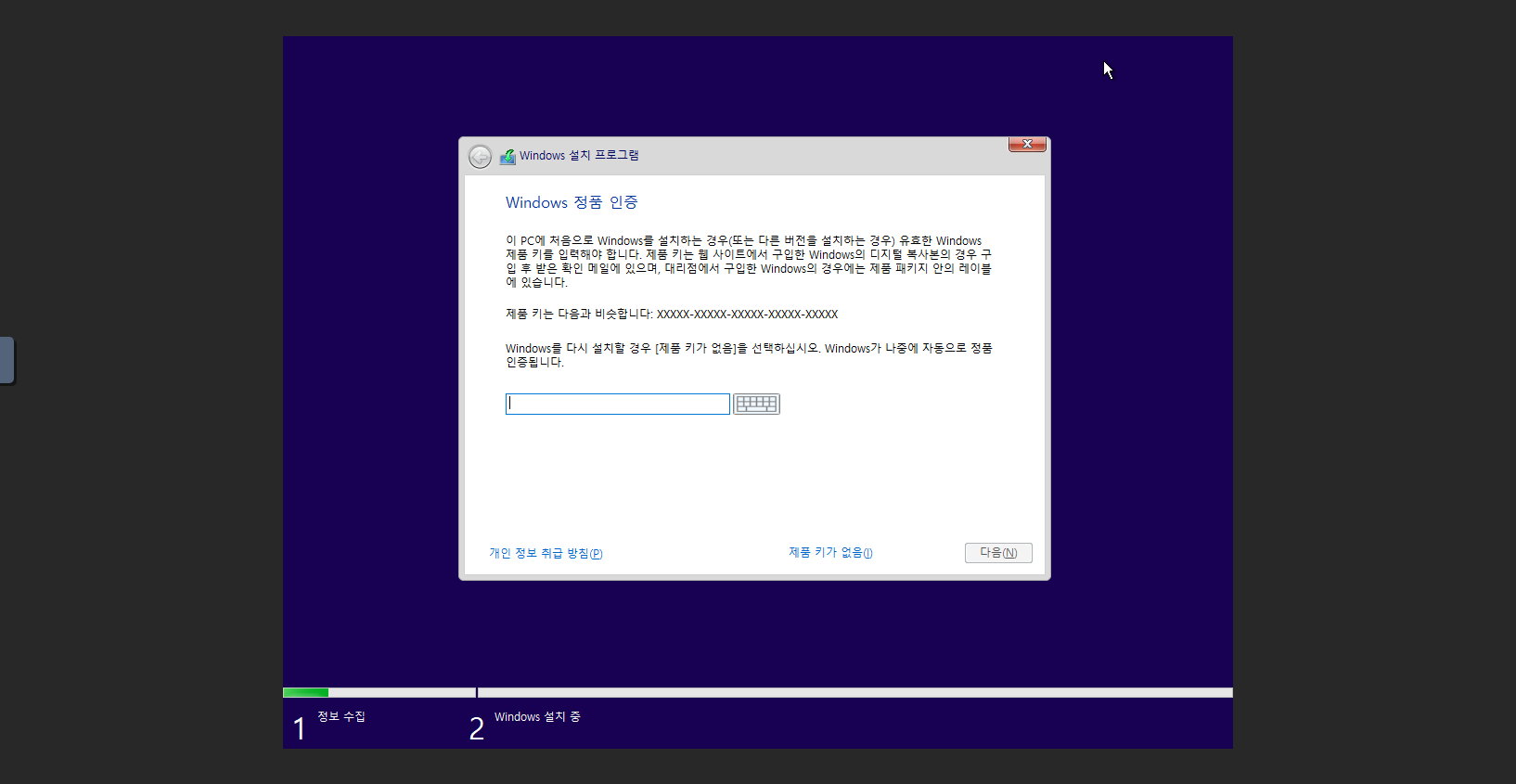 윈도우 정품 인증을 위한 시디키 입력을 하는 화면입니다. 1. Windows 10 정품키가 없는 경우 제품 키가 없음 버튼을 클릭합니다.