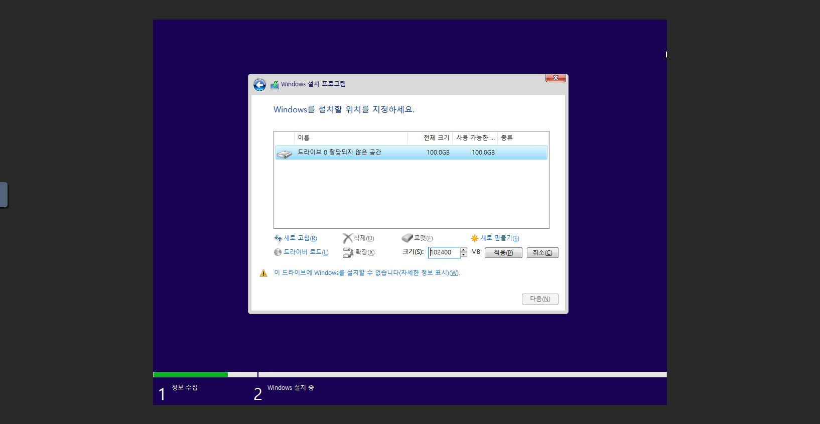 Windows 를 설치할 위치를 지정하세요.